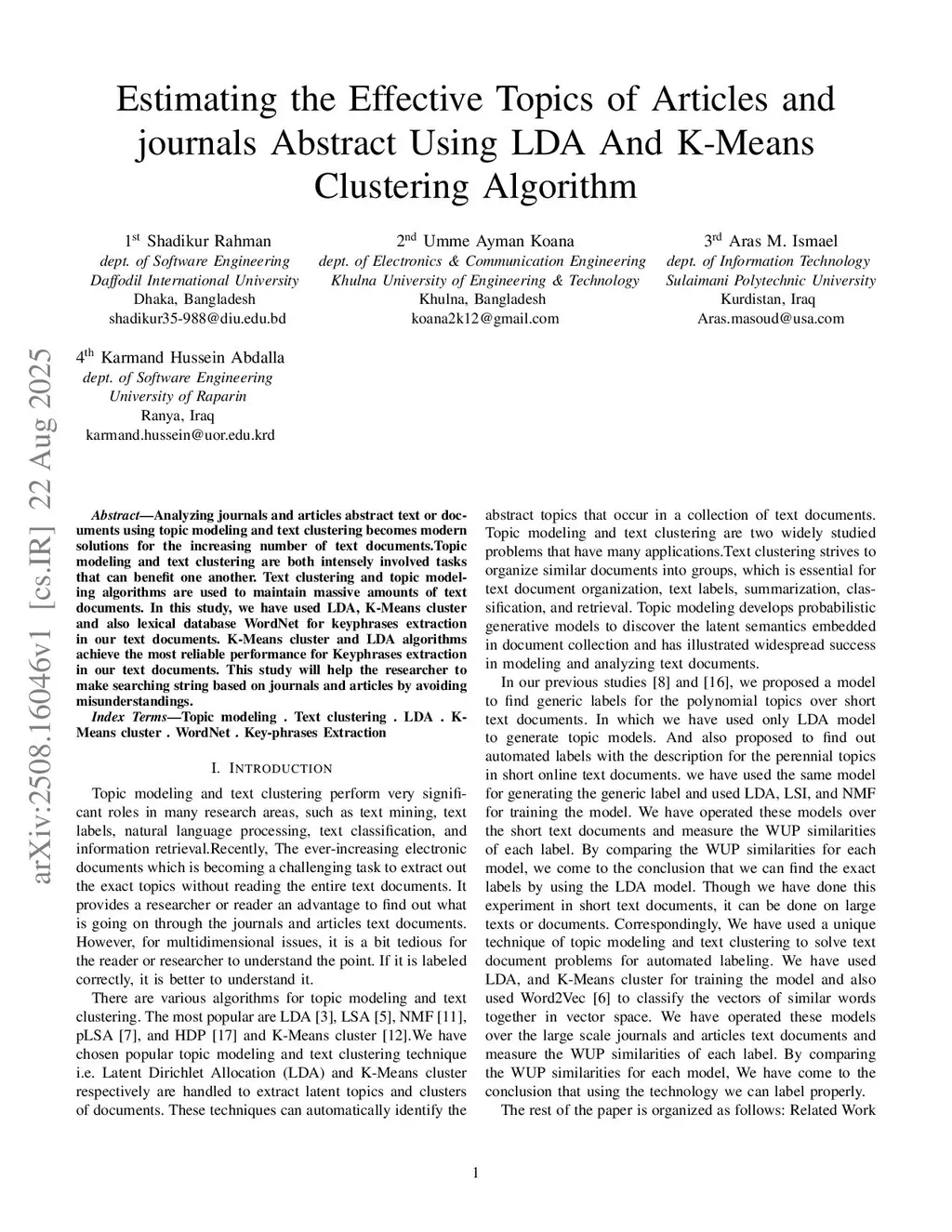 Estimating the Effective Topics of Articles and journals Abstract Using LDA And K-Means Clustering Algorithm