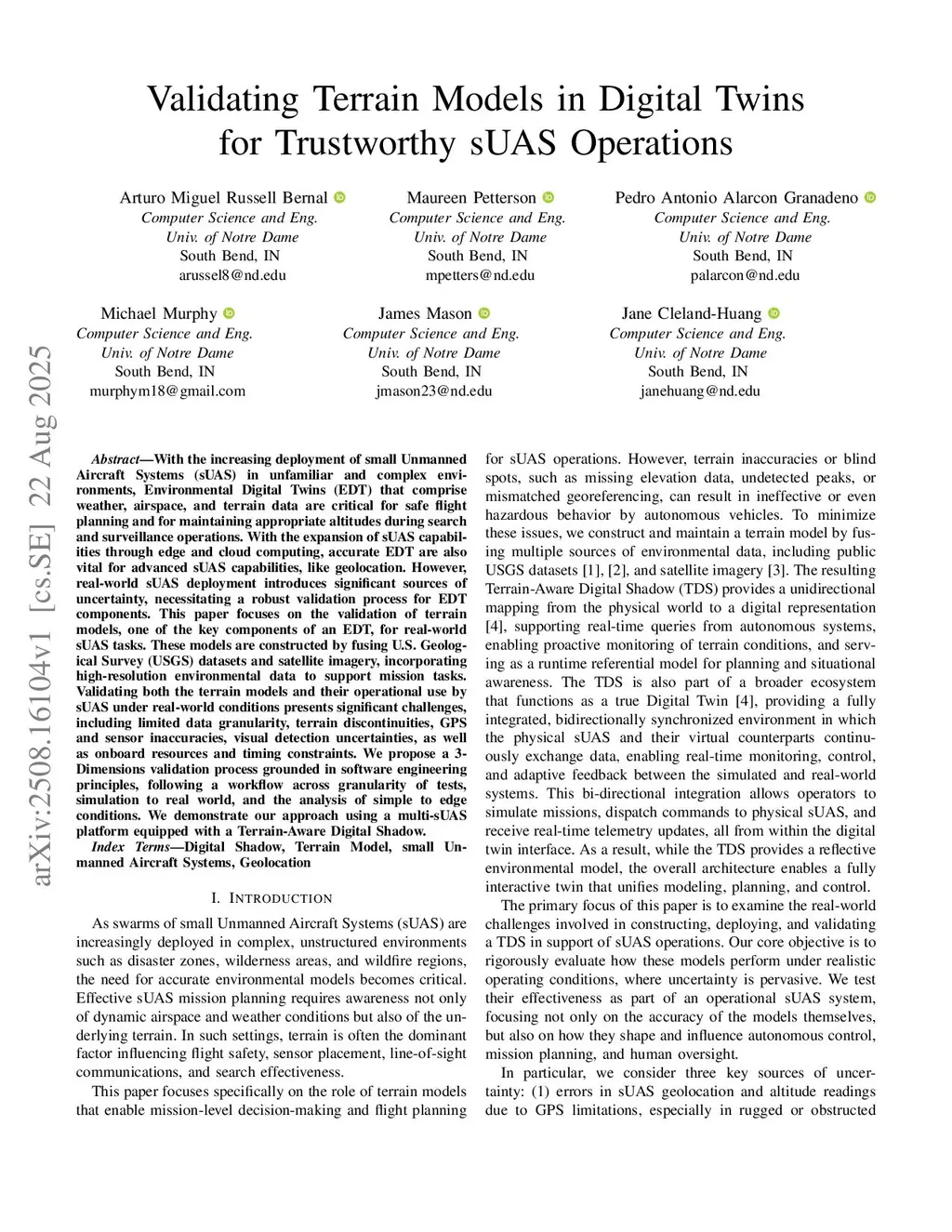 With the increasing deployment of small Unmanned Aircraft Systems (sUAS) in unfamiliar and complex environments, Environmental Digital Twins (EDT) that comprise weather, airspace, and terrain data are critical for safe flight planning and for maintaining appropriate altitudes during search and surveillance operations. With the expansion of sUAS capabilities through edge and cloud computing, accurate EDT are also vital for advanced sUAS capabilities, like geolocation. However, real-world sUAS deployment introduces significant sources of uncertainty, necessitating a robust validation process for EDT components. This paper focuses on the validation of terrain models, one of the key components of an EDT, for real-world sUAS tasks. These models are constructed by fusing U.S. Geological Survey (USGS) datasets and satellite imagery, incorporating high-resolution environmental data to support mission tasks. Validating both the terrain models and their operational use by sUAS under real-world conditions presents significant challenges, including limited data granularity, terrain discontinuities, GPS and sensor inaccuracies, visual detection uncertainties, as well as onboard resources and timing constraints. We propose a 3-Dimensions validation process grounded in software engineering principles, following a workflow across granularity of tests, simulation to real world, and the analysis of simple to edge conditions. We demonstrate our approach using a multi-sUAS platform equipped with a Terrain-Aware Digital Shadow.