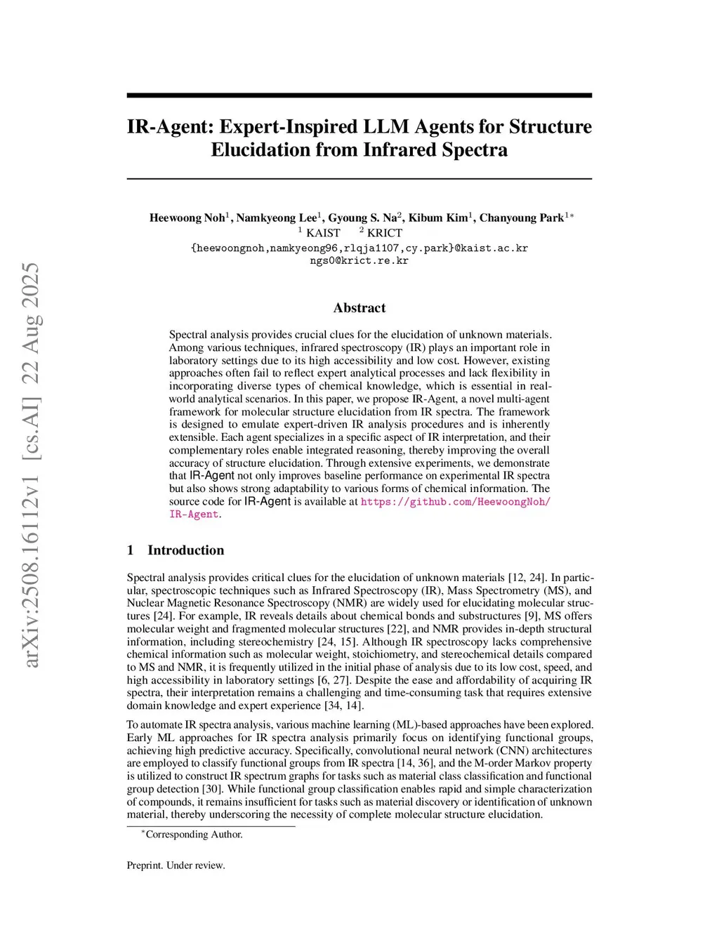 Spectral analysis provides crucial clues for the elucidation of unknown materials. Among various techniques, infrared spectroscopy (IR) plays an important role in laboratory settings due to its high accessibility and low cost. However, existing approaches often fail to reflect expert analytical processes and lack flexibility in incorporating diverse types of chemical knowledge, which is essential in real-world analytical scenarios. In this paper, we propose IR-Agent, a novel multi-agent framework for molecular structure elucidation from IR spectra. The framework is designed to emulate expert-driven IR analysis procedures and is inherently extensible. Each agent specializes in a specific aspect of IR interpretation, and their complementary roles enable integrated reasoning, thereby improving the overall accuracy of structure elucidation. Through extensive experiments, we demonstrate that IR-Agent not only improves baseline performance on experimental IR spectra but also shows strong adaptability to various forms of chemical information.