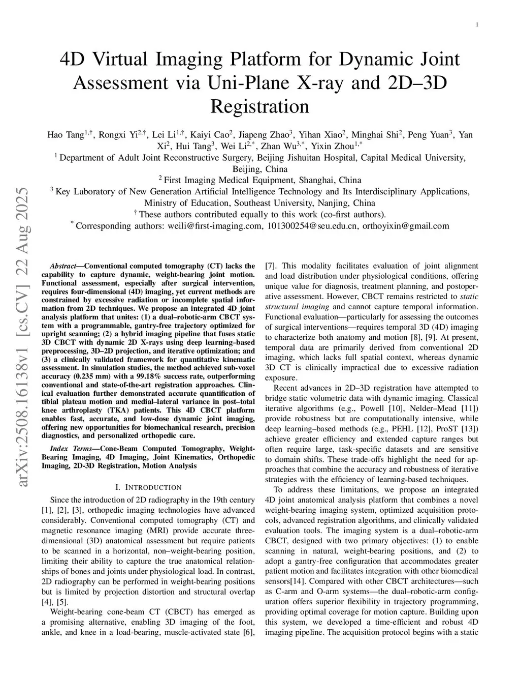 Conventional computed tomography (CT) lacks the ability to capture dynamic, weight-bearing joint motion. Functional evaluation, particularly after surgical intervention, requires four-dimensional (4D) imaging, but current methods are limited by excessive radiation exposure or incomplete spatial information from 2D techniques. We propose an integrated 4D joint analysis platform that combines: (1) a dual robotic arm cone-beam CT (CBCT) system with a programmable, gantry-free trajectory optimized for upright scanning; (2) a hybrid imaging pipeline that fuses static 3D CBCT with dynamic 2D X-rays using deep learning-based preprocessing, 3D-2D projection, and iterative optimization; and (3) a clinically validated framework for quantitative kinematic assessment. In simulation studies, the method achieved sub-voxel accuracy (0.235 mm) with a 99.18 percent success rate, outperforming conventional and state-of-the-art registration approaches. Clinical evaluation further demonstrated accurate quantification of tibial plateau motion and medial-lateral variance in post-total knee arthroplasty (TKA) patients. This 4D CBCT platform enables fast, accurate, and low-dose dynamic joint imaging, offering new opportunities for biomechanical research, precision diagnostics, and personalized orthopedic care.