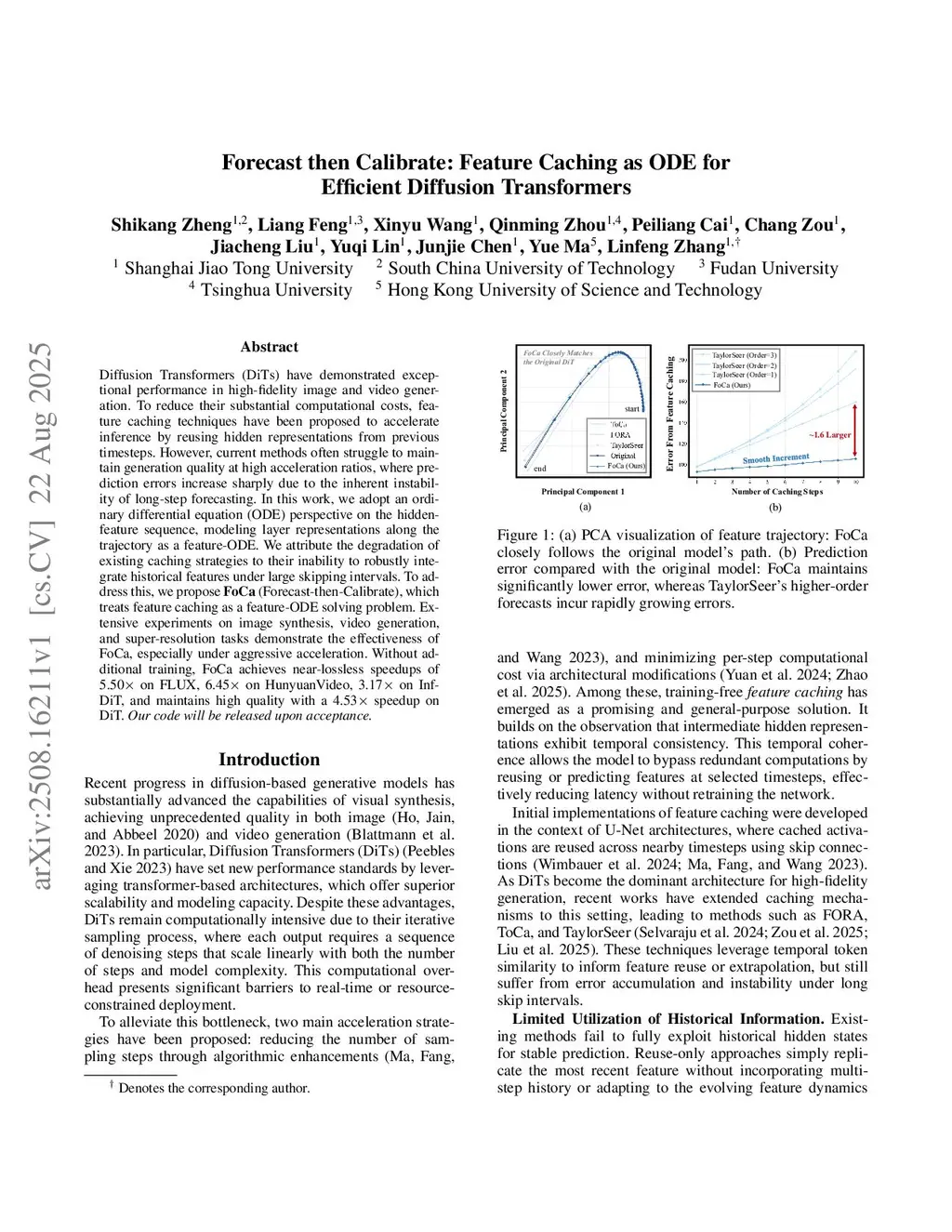 Diffusion Transformers (DiTs) have demonstrated exceptional performance in high-fidelity image and video generation. To reduce their substantial computational costs, feature caching techniques have been proposed to accelerate inference by reusing hidden representations from previous timesteps. However, current methods often struggle to maintain generation quality at high acceleration ratios, where prediction errors increase sharply due to the inherent instability of long-step forecasting. In this work, we adopt an ordinary differential equation (ODE) perspective on the hidden-feature sequence, modeling layer representations along the trajectory as a feature-ODE. We attribute the degradation of existing caching strategies to their inability to robustly integrate historical features under large skipping intervals. To address this, we propose FoCa (Forecast-then-Calibrate), which treats feature caching as a feature-ODE solving problem. Extensive experiments on image synthesis, video generation, and super-resolution tasks demonstrate the effectiveness of FoCa, especially under aggressive acceleration. Without additional training, FoCa achieves near-lossless speedups of 5.50 times on FLUX, 6.45 times on HunyuanVideo, 3.17 times on Inf-DiT, and maintains high quality with a 4.53 times speedup on DiT.