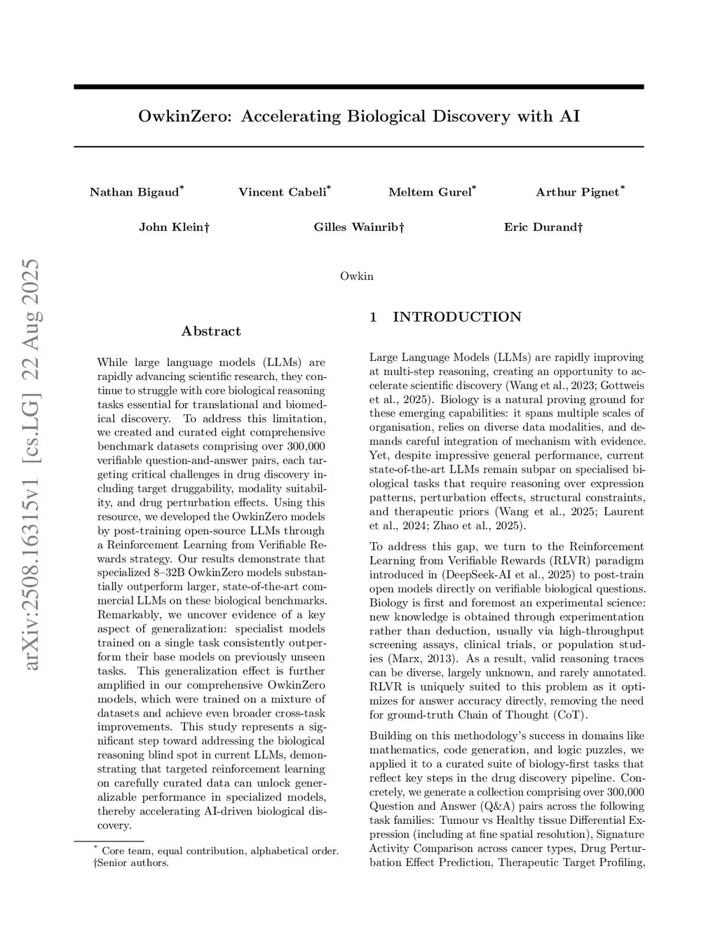 While large language models (LLMs) are rapidly advancing scientific research, they continue to struggle with core biological reasoning tasks essential for translational and biomedical discovery. To address this limitation, we created and curated eight comprehensive benchmark datasets comprising over 300,000 verifiable question-and-answer pairs, each targeting critical challenges in drug discovery including target druggability, modality suitability, and drug perturbation effects. Using this resource, we developed the OwkinZero models by post-training open-source LLMs through a Reinforcement Learning from Verifiable Rewards strategy. Our results demonstrate that specialized 8-32B OwkinZero models substantially outperform larger, state-of-the-art commercial LLMs on these biological benchmarks. Remarkably, we uncover evidence of a key aspect of generalization: specialist models trained on a single task consistently outperform their base models on previously unseen tasks. This generalization effect is further amplified in our comprehensive OwkinZero models, which were trained on a mixture of datasets and achieve even broader cross-task improvements. This study represents a significant step toward addressing the biological reasoning blind spot in current LLMs, demonstrating that targeted reinforcement learning on carefully curated data can unlock generalizable performance in specialized models, thereby accelerating AI-driven biological discovery.
