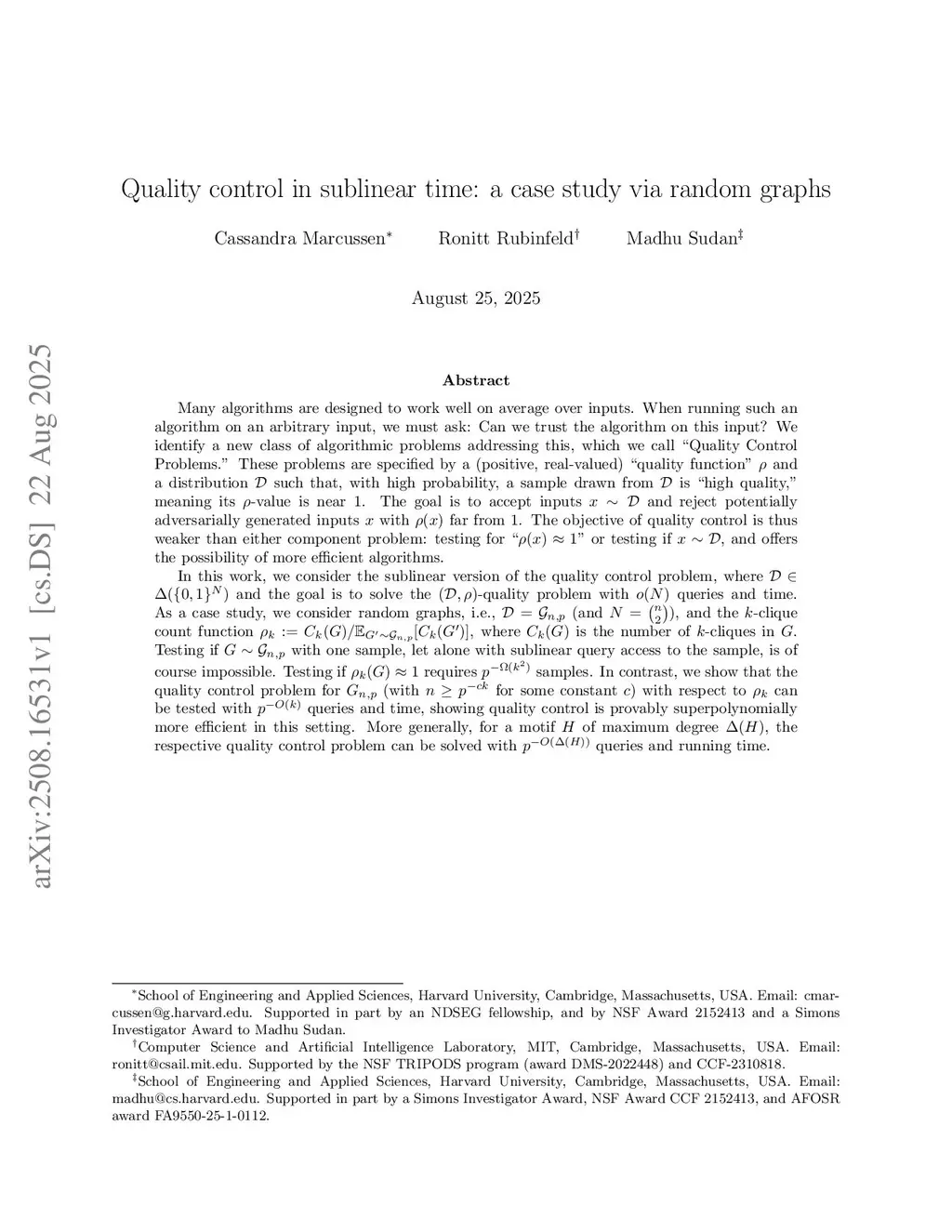 Quality control in sublinear time: a case study via random graphs