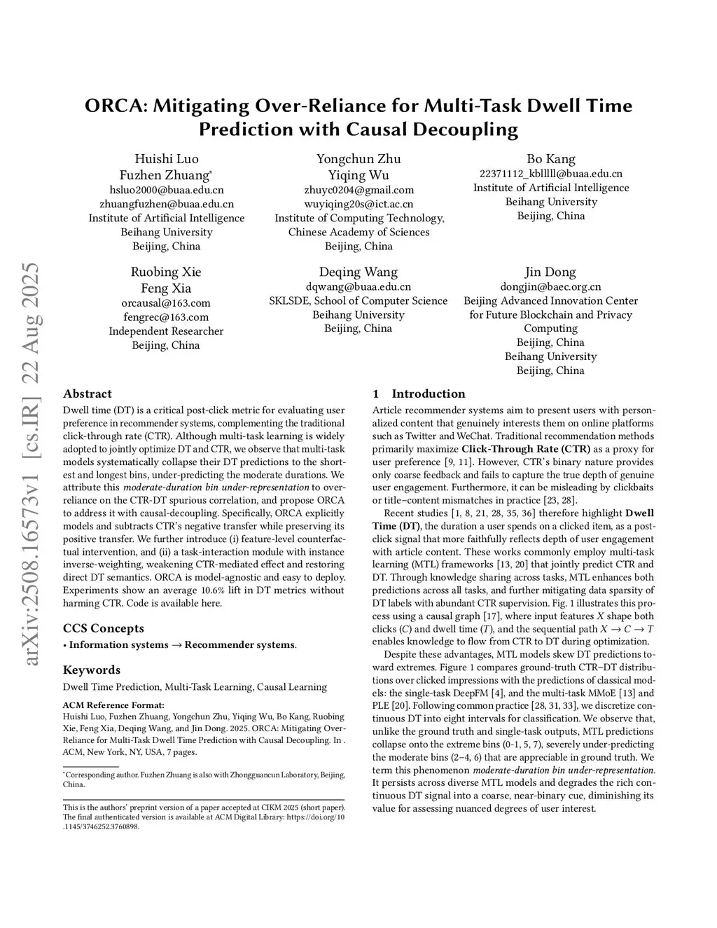 Dwell time (DT) is a critical post-click metric for evaluating user preference in recommender systems, complementing the traditional click-through rate (CTR). Although multi-task learning is widely adopted to jointly optimize DT and CTR, we observe that multi-task models systematically collapse their DT predictions to the shortest and longest bins, under-predicting the moderate durations. We attribute this moderate-duration bin under-representation to over-reliance on the CTR-DT spurious correlation, and propose ORCA to address it with causal-decoupling. Specifically, ORCA explicitly models and subtracts CTR's negative transfer while preserving its positive transfer. We further introduce (i) feature-level counterfactual intervention, and (ii) a task-interaction module with instance inverse-weighting, weakening CTR-mediated effect and restoring direct DT semantics. ORCA is model-agnostic and easy to deploy. Experiments show an average 10.6% lift in DT metrics without harming CTR. Code is available atthis https URL.