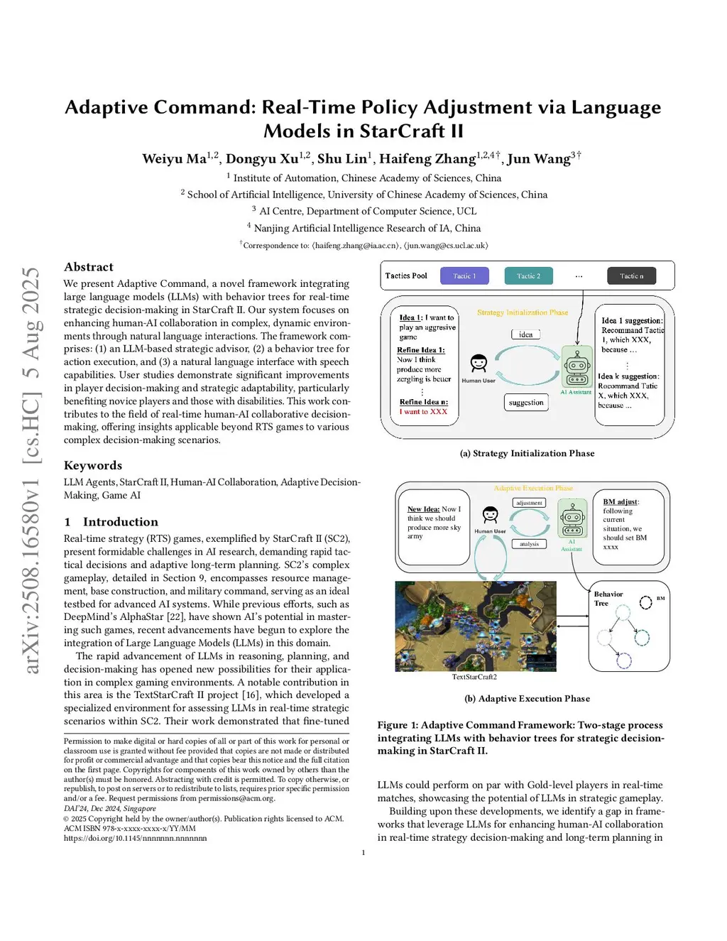 We present Adaptive Command, a novel framework integrating large language models (LLMs) with behavior trees for real-time strategic decision-making in StarCraft II. Our system focuses on enhancing human-AI collaboration in complex, dynamic environments through natural language interactions. The framework comprises: (1) an LLM-based strategic advisor, (2) a behavior tree for action execution, and (3) a natural language interface with speech capabilities. User studies demonstrate significant improvements in player decision-making and strategic adaptability, particularly benefiting novice players and those with disabilities. This work contributes to the field of real-time human-AI collaborative decision-making, offering insights applicable beyond RTS games to various complex decision-making scenarios.