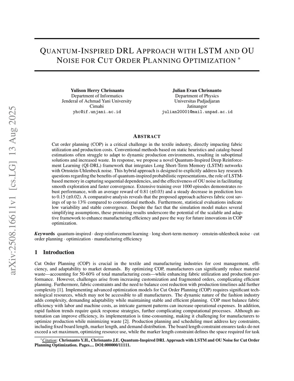 Cut order planning (COP) is a critical challenge in the textile industry, directly impacting fabric utilization and production costs. Conventional methods based on static heuristics and catalog-based estimations often struggle to adapt to dynamic production environments, resulting in suboptimal solutions and increased waste. In response, we propose a novel Quantum-Inspired Deep Reinforcement Learning (QI-DRL) framework that integrates Long Short-Term Memory (LSTM) networks with Ornstein-Uhlenbeck noise. This hybrid approach is designed to explicitly address key research questions regarding the benefits of quantum-inspired probabilistic representations, the role of LSTM-based memory in capturing sequential dependencies, and the effectiveness of OU noise in facilitating smooth exploration and faster convergence. Extensive training over 1000 episodes demonstrates robust performance, with an average reward of 0.81 (-+0.03) and a steady decrease in prediction loss to 0.15 (-+0.02). A comparative analysis reveals that the proposed approach achieves fabric cost savings of up to 13% compared to conventional methods. Furthermore, statistical evaluations indicate low variability and stable convergence. Despite the fact that the simulation model makes several simplifying assumptions, these promising results underscore the potential of the scalable and adaptive framework to enhance manufacturing efficiency and pave the way for future innovations in COP optimization.