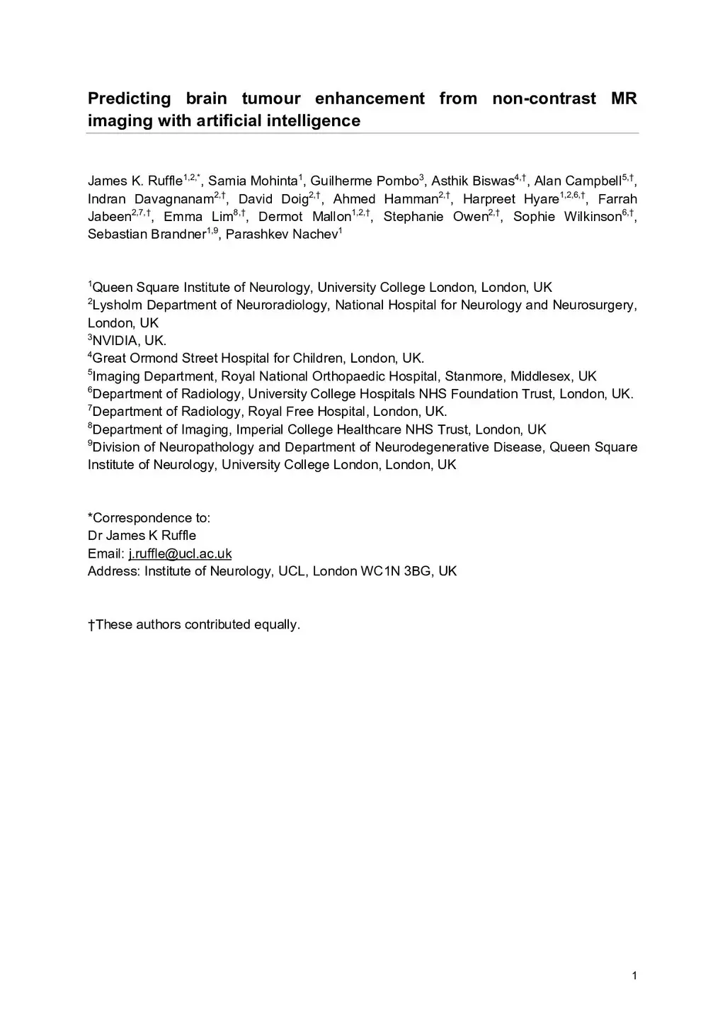 Predicting brain tumour enhancement from non-contrast MR imaging with artificial intelligence