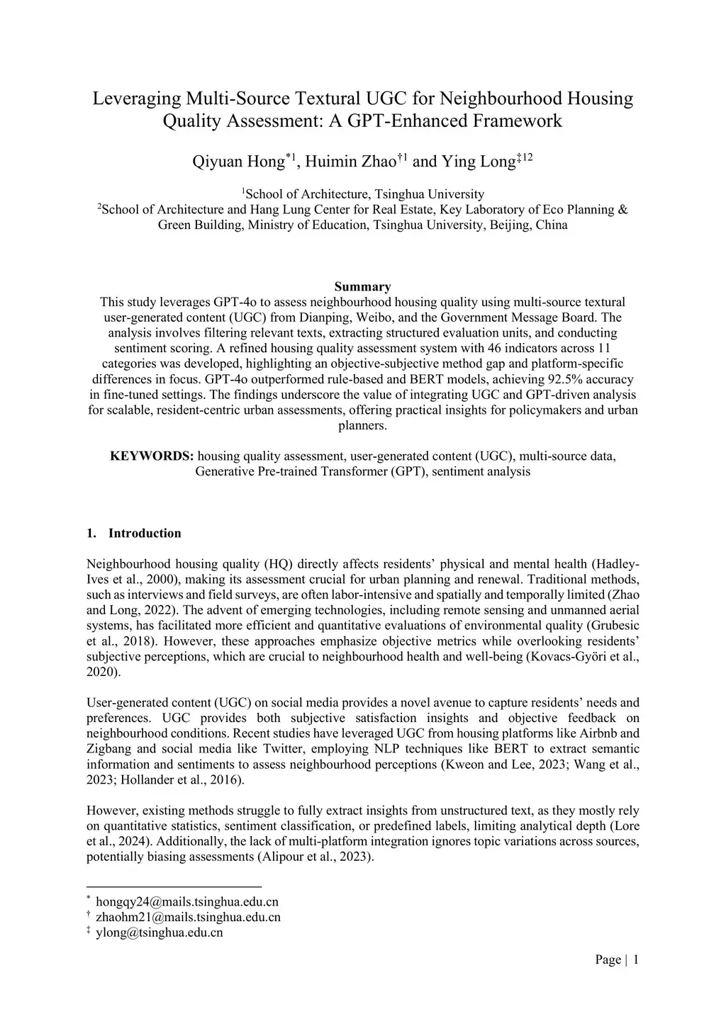 This study leverages GPT-4o to assess neighbourhood housing quality using multi-source textural user-generated content (UGC) from Dianping, Weibo, and the Government Message Board. The analysis involves filtering relevant texts, extracting structured evaluation units, and conducting sentiment scoring. A refined housing quality assessment system with 46 indicators across 11 categories was developed, highlighting an objective-subjective method gap and platform-specific differences in focus. GPT-4o outperformed rule-based and BERT models, achieving 92.5% accuracy in fine-tuned settings. The findings underscore the value of integrating UGC and GPT-driven analysis for scalable, resident-centric urban assessments, offering practical insights for policymakers and urban planners.