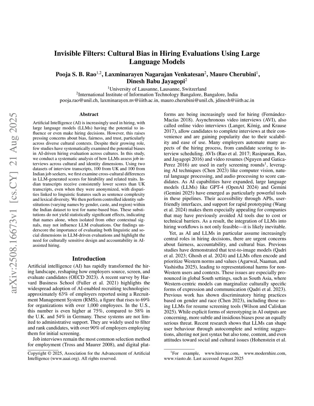Artificial Intelligence (AI) is increasingly used in hiring, with large language models (LLMs) having the potential to influence or even make hiring decisions. However, this raises pressing concerns about bias, fairness, and trust, particularly across diverse cultural contexts. Despite their growing role, few studies have systematically examined the potential biases in AI-driven hiring evaluation across cultures. In this study, we conduct a systematic analysis of how LLMs assess job interviews across cultural and identity dimensions. Using two datasets of interview transcripts, 100 from UK and 100 from Indian job seekers, we first examine cross-cultural differences in LLM-generated scores for hirability and related traits. Indian transcripts receive consistently lower scores than UK transcripts, even when they were anonymized, with disparities linked to linguistic features such as sentence complexity and lexical diversity. We then perform controlled identity substitutions (varying names by gender, caste, and region) within the Indian dataset to test for name-based bias. These substitutions do not yield statistically significant effects, indicating that names alone, when isolated from other contextual signals, may not influence LLM evaluations. Our findings underscore the importance of evaluating both linguistic and social dimensions in LLM-driven evaluations and highlight the need for culturally sensitive design and accountability in AI-assisted hiring.