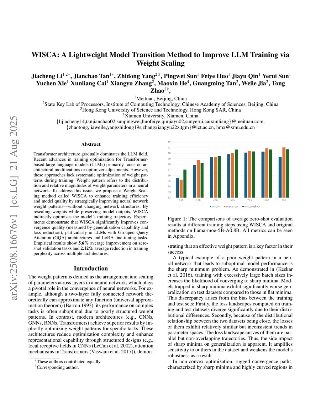 WISCA: A Lightweight Model Transition Method to Improve LLM Training via Weight Scaling
