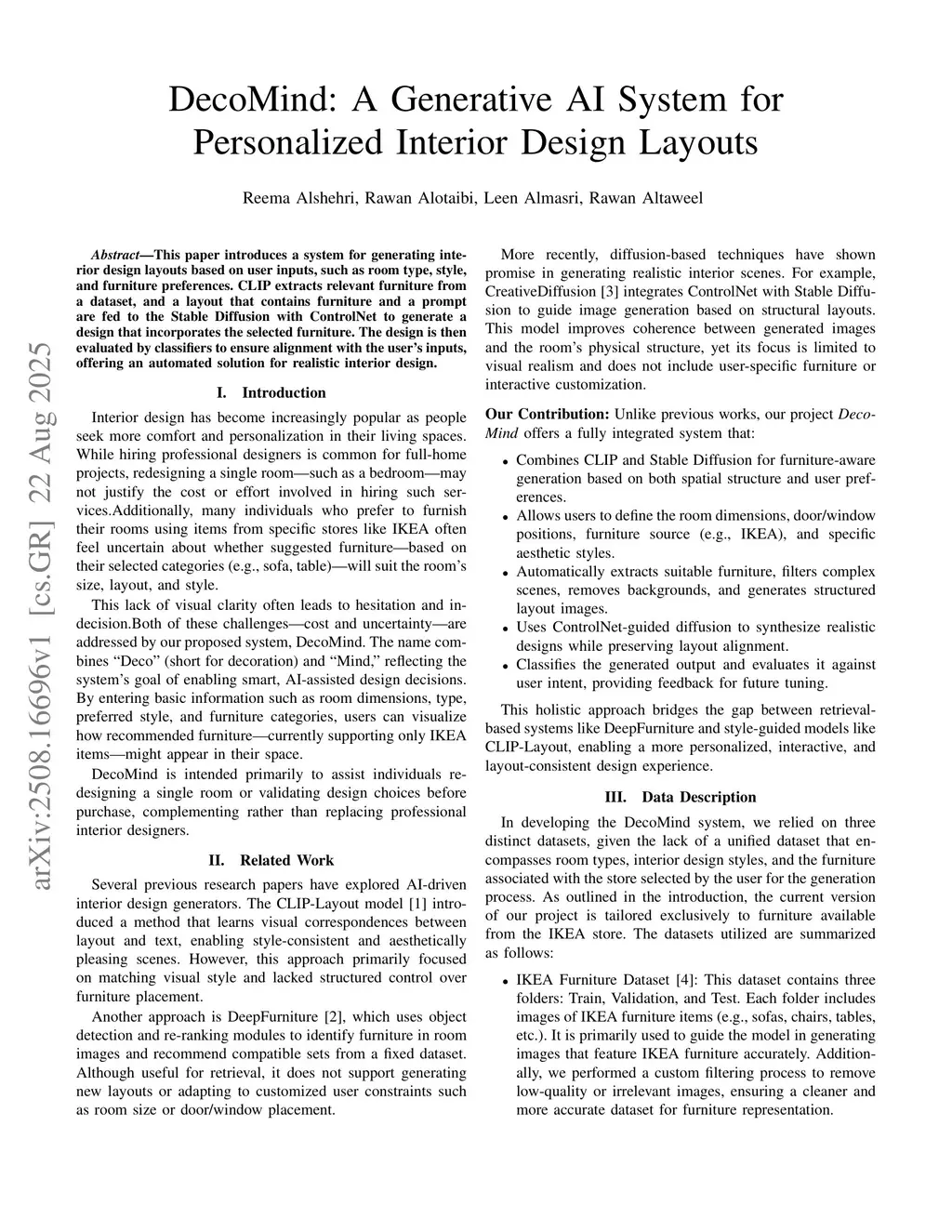 This paper introduces a system for generating interior design layouts based on user inputs, such as room type, style, and furniture preferences. CLIP extracts relevant furniture from a dataset, and a layout that contains furniture and a prompt are fed to Stable Diffusion with ControlNet to generate a design that incorporates the selected furniture. The design is then evaluated by classifiers to ensure alignment with the user's inputs, offering an automated solution for realistic interior design.