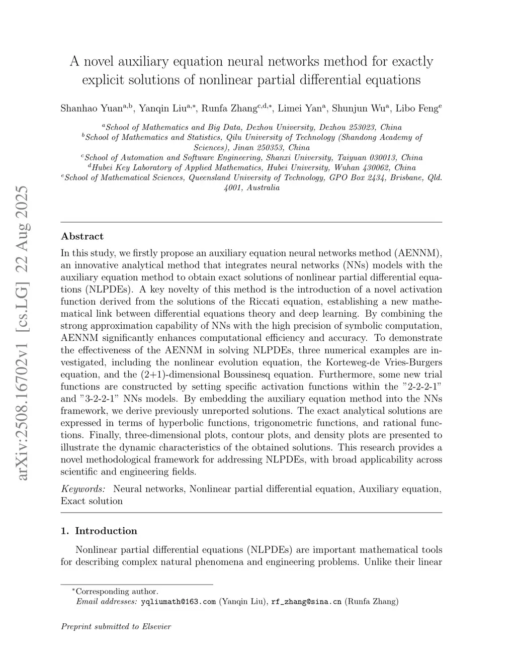 In this study, we firstly propose an auxiliary equation neural networks method (AENNM), an innovative analytical method that integrates neural networks (NNs) models with the auxiliary equation method to obtain exact solutions of nonlinear partial differential equations (NLPDEs). A key novelty of this method is the introduction of a novel activation function derived from the solutions of the Riccati equation, establishing a new mathematical link between differential equations theory and deep learning. By combining the strong approximation capability of NNs with the high precision of symbolic computation, AENNM significantly enhances computational efficiency and accuracy. To demonstrate the effectiveness of the AENNM in solving NLPDEs, three numerical examples are investigated, including the nonlinear evolution equation, the Korteweg-de Vries-Burgers equation, and the (2+1)-dimensional Boussinesq equation. Furthermore, some new trial functions are constructed by setting specific activation functions within the "2-2-2-1" and "3-2-2-1" NNs models. By embedding the auxiliary equation method into the NNs framework, we derive previously unreported solutions. The exact analytical solutions are expressed in terms of hyperbolic functions, trigonometric functions, and rational functions. Finally, three-dimensional plots, contour plots, and density plots are presented to illustrate the dynamic characteristics of the obtained solutions. This research provides a novel methodological framework for addressing NLPDEs, with broad applicability across scientific and engineering fields.