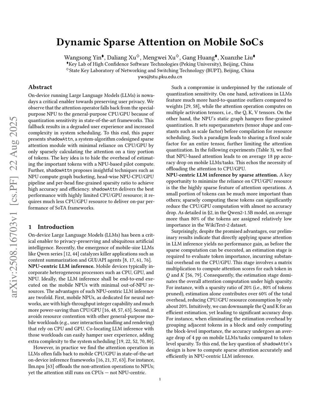 On-device running Large Language Models (LLMs) is nowadays a critical enabler towards preserving user privacy. We observe that the attention operator falls back from the special-purpose NPU to the general-purpose CPU/GPU because of quantization sensitivity in state-of-the-art frameworks. This fallback results in a degraded user experience and increased complexity in system scheduling. To this end, this paper presents shadowAttn, a system-algorithm codesigned sparse attention module with minimal reliance on CPU/GPU by only sparsely calculating the attention on a tiny portion of tokens. The key idea is to hide the overhead of estimating the important tokens with a NPU-based pilot compute. Further, shadowAttn proposes insightful techniques such as NPU compute graph bucketing, head-wise NPU-CPU/GPU pipeline and per-head fine-grained sparsity ratio to achieve high accuracy and efficiency. shadowAttn delivers the best performance with highly limited CPU/GPU resource; it requires much less CPU/GPU resource to deliver on-par performance of SoTA frameworks.