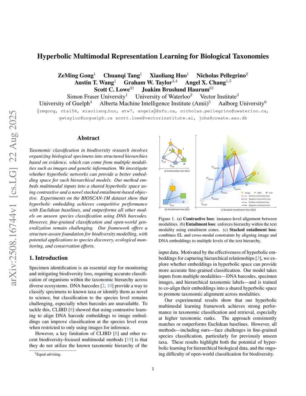 Taxonomic classification in biodiversity research involves organizing biological specimens into structured hierarchies based on evidence, which can come from multiple modalities such as images and genetic information. We investigate whether hyperbolic networks can provide a better embedding space for such hierarchical models. Our method embeds multimodal inputs into a shared hyperbolic space using contrastive and a novel stacked entailment-based objective. Experiments on the BIOSCAN-1M dataset show that hyperbolic embedding achieves competitive performance with Euclidean baselines, and outperforms all other models on unseen species classification using DNA barcodes. However, fine-grained classification and open-world generalization remain challenging. Our framework offers a structure-aware foundation for biodiversity modelling, with potential applications to species discovery, ecological monitoring, and conservation efforts.