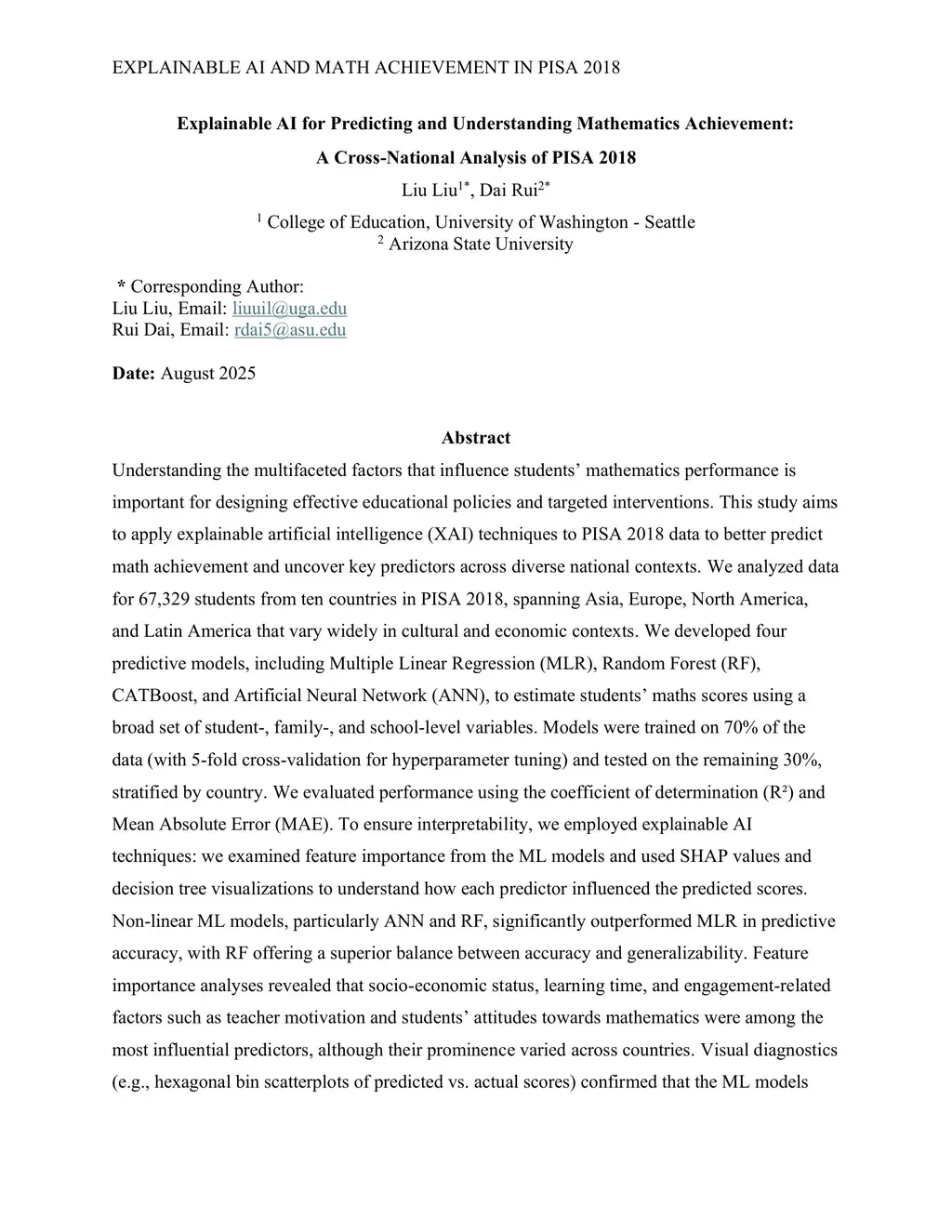Understanding the factors that shape students' mathematics performance is vital for designing effective educational policies. This study applies explainable artificial intelligence (XAI) techniques to PISA 2018 data to predict math achievement and identify key predictors across ten countries (67,329 students). We tested four models: Multiple Linear Regression (MLR), Random Forest (RF), CATBoost, and Artificial Neural Networks (ANN), using student, family, and school variables. Models were trained on 70% of the data (with 5-fold cross-validation) and tested on 30%, stratified by country. Performance was assessed with R^2 and Mean Absolute Error (MAE). To ensure interpretability, we used feature importance, SHAP values, and decision tree visualizations. Non-linear models, especially RF and ANN, outperformed MLR, with RF balancing accuracy and generalizability. Key predictors included socio-economic status, study time, teacher motivation, and students' attitudes toward mathematics, though their impact varied across countries. Visual diagnostics such as scatterplots of predicted vs actual scores showed RF and CATBoost aligned closely with actual performance. Findings highlight the non-linear and context-dependent nature of achievement and the value of XAI in educational research. This study uncovers cross-national patterns, informs equity-focused reforms, and supports the development of personalized learning strategies.