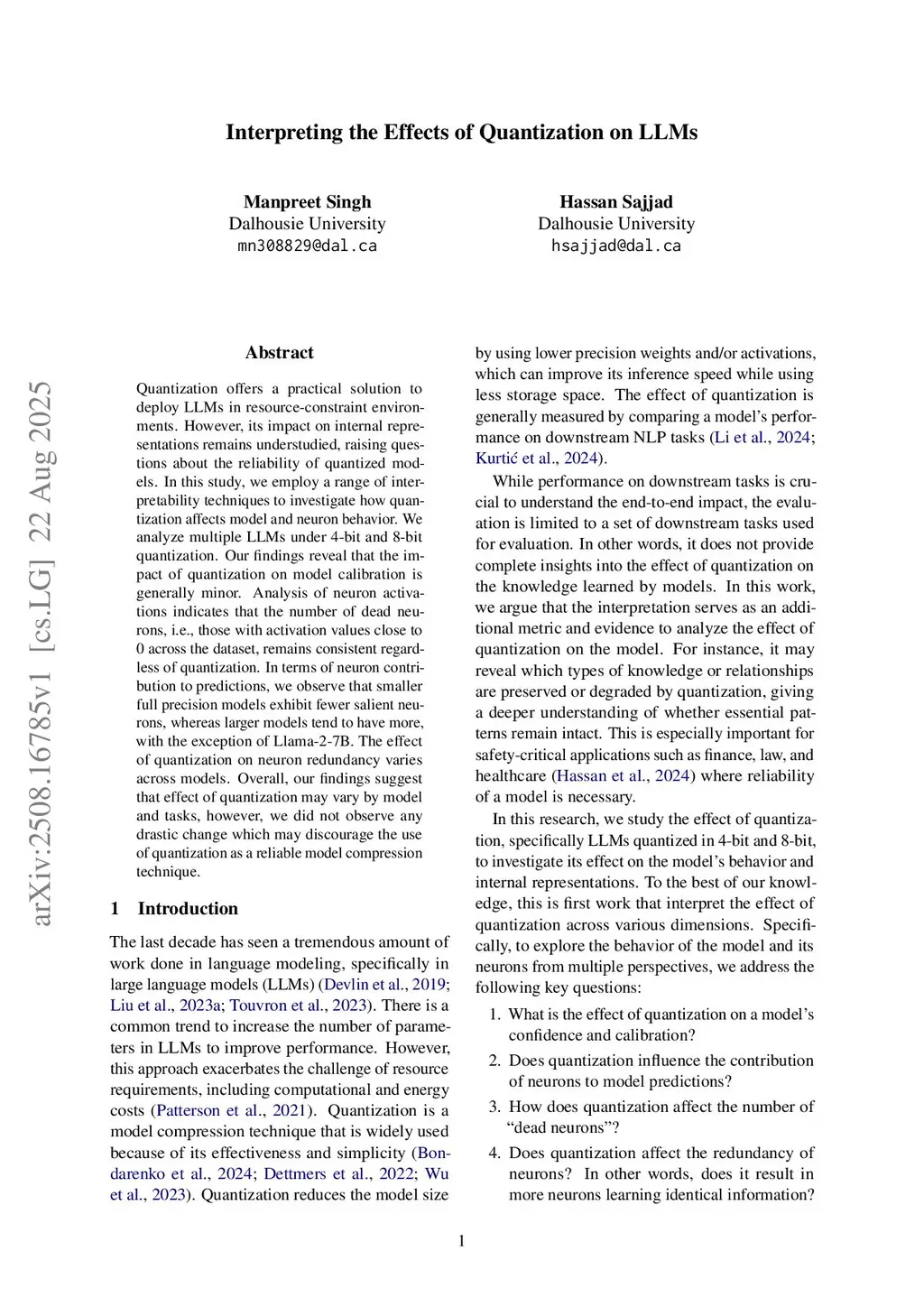 Quantization offers a practical solution to deploy LLMs in resource-constraint environments. However, its impact on internal representations remains understudied, raising questions about the reliability of quantized models. In this study, we employ a range of interpretability techniques to investigate how quantization affects model and neuron behavior. We analyze multiple LLMs under 4-bit and 8-bit quantization. Our findings reveal that the impact of quantization on model calibration is generally minor. Analysis of neuron activations indicates that the number of dead neurons, i.e., those with activation values close to 0 across the dataset, remains consistent regardless of quantization. In terms of neuron contribution to predictions, we observe that smaller full precision models exhibit fewer salient neurons, whereas larger models tend to have more, with the exception of Llama-2-7B. The effect of quantization on neuron redundancy varies across models. Overall, our findings suggest that effect of quantization may vary by model and tasks, however, we did not observe any drastic change which may discourage the use of quantization as a reliable model compression technique.