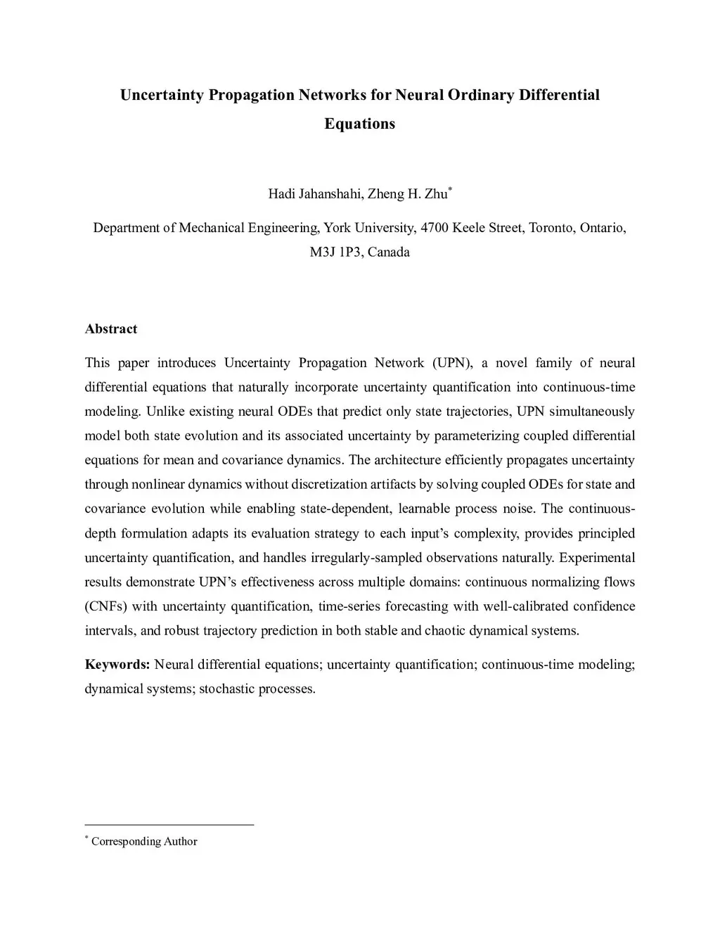This paper introduces Uncertainty Propagation Network (UPN), a novel family of neural differential equations that naturally incorporate uncertainty quantification into continuous-time modeling. Unlike existing neural ODEs that predict only state trajectories, UPN simultaneously model both state evolution and its associated uncertainty by parameterizing coupled differential equations for mean and covariance dynamics. The architecture efficiently propagates uncertainty through nonlinear dynamics without discretization artifacts by solving coupled ODEs for state and covariance evolution while enabling state-dependent, learnable process noise. The continuous-depth formulation adapts its evaluation strategy to each input's complexity, provides principled uncertainty quantification, and handles irregularly-sampled observations naturally. Experimental results demonstrate UPN's effectiveness across multiple domains: continuous normalizing flows (CNFs) with uncertainty quantification, time-series forecasting with well-calibrated confidence intervals, and robust trajectory prediction in both stable and chaotic dynamical systems.