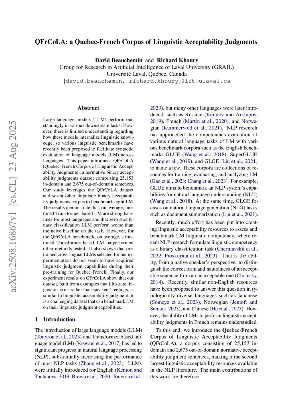 Large and Transformer-based language models perform outstandingly in various downstream tasks. However, there is limited understanding regarding how these models internalize linguistic knowledge, so various linguistic benchmarks have recently been proposed to facilitate syntactic evaluation of language models across languages. This paper introduces QFrCoLA (Quebec-French Corpus of Linguistic Acceptability Judgments), a normative binary acceptability judgments dataset comprising 25,153 in-domain and 2,675 out-of-domain sentences. Our study leverages the QFrCoLA dataset and seven other linguistic binary acceptability judgment corpora to benchmark seven language models. The results demonstrate that, on average, fine-tuned Transformer-based LM are strong baselines for most languages and that zero-shot binary classification large language models perform poorly on the task. However, for the QFrCoLA benchmark, on average, a fine-tuned Transformer-based LM outperformed other methods tested. It also shows that pre-trained cross-lingual LLMs selected for our experimentation do not seem to have acquired linguistic judgment capabilities during their pre-training for Quebec French. Finally, our experiment results on QFrCoLA show that our dataset, built from examples that illustrate linguistic norms rather than speakers' feelings, is similar to linguistic acceptability judgment; it is a challenging dataset that can benchmark LM on their linguistic judgment capabilities.