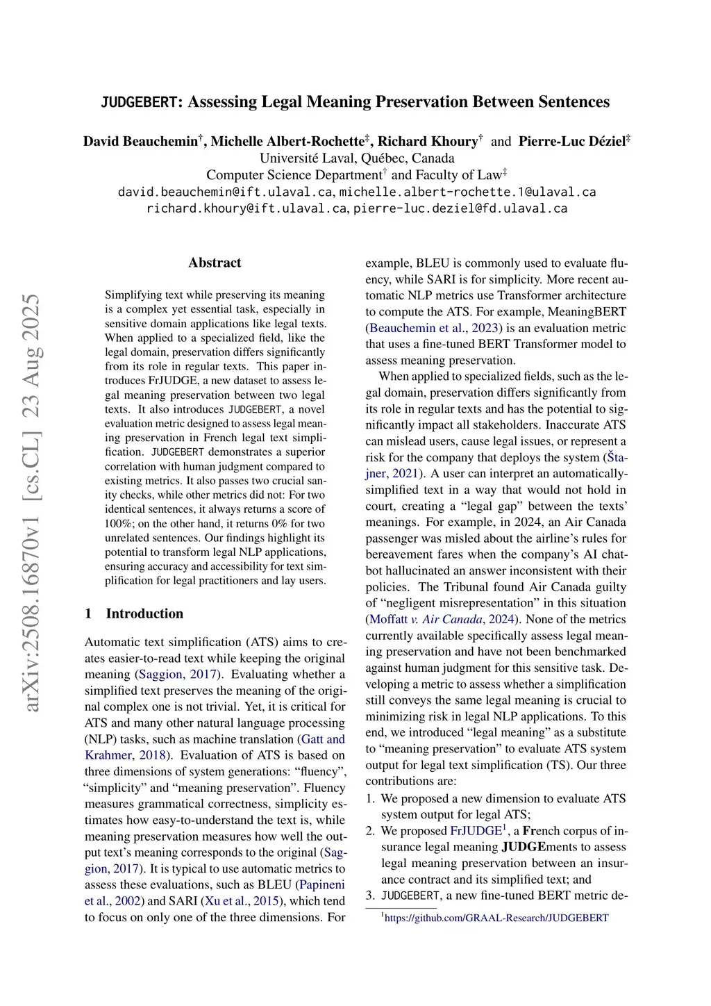 Simplifying text while preserving its meaning is a complex yet essential task, especially in sensitive domain applications like legal texts. When applied to a specialized field, like the legal domain, preservation differs significantly from its role in regular texts. This paper introduces FrJUDGE, a new dataset to assess legal meaning preservation between two legal texts. It also introduces JUDGEBERT, a novel evaluation metric designed to assess legal meaning preservation in French legal text simplification. JUDGEBERT demonstrates a superior correlation with human judgment compared to existing metrics. It also passes two crucial sanity checks, while other metrics did not: For two identical sentences, it always returns a score of 100%; on the other hand, it returns 0% for two unrelated sentences. Our findings highlight its potential to transform legal NLP applications, ensuring accuracy and accessibility for text simplification for legal practitioners and lay users.