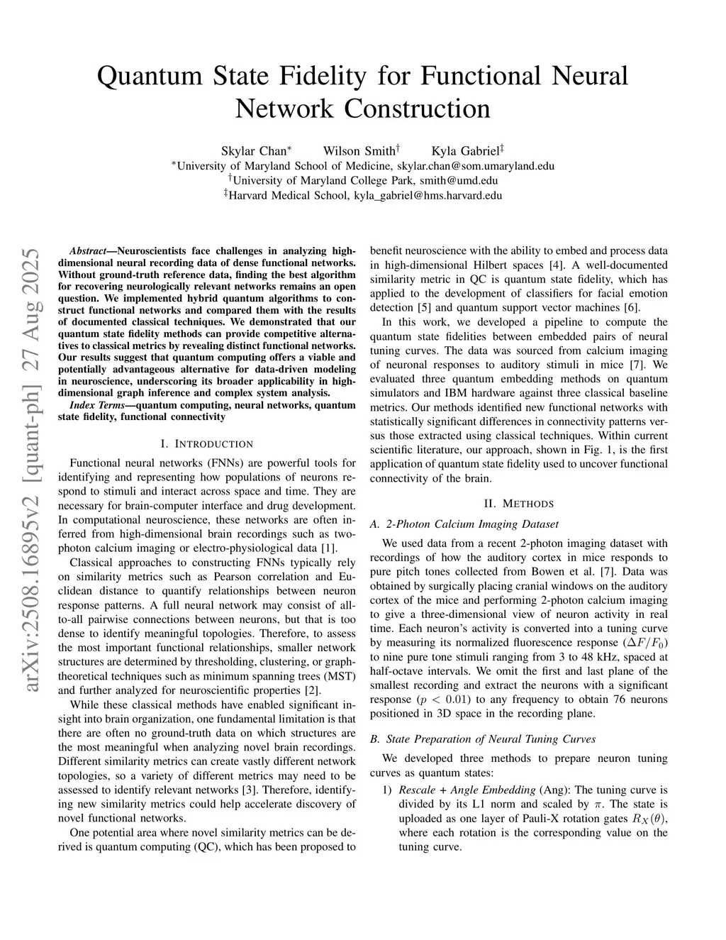 Neuroscientists face challenges in analyzing high-dimensional neural recording data of dense functional networks. Without ground-truth reference data, finding the best algorithm for recovering neurologically relevant networks remains an open question. We implemented hybrid quantum algorithms to construct functional networks and compared them with the results of documented classical techniques. We demonstrated that our quantum state fidelity methods can provide competitive alternatives to classical metrics by revealing distinct functional networks. Our results suggest that quantum computing offers a viable and potentially advantageous alternative for data-driven modeling in neuroscience, underscoring its broader applicability in high-dimensional graph inference and complex system analysis.
