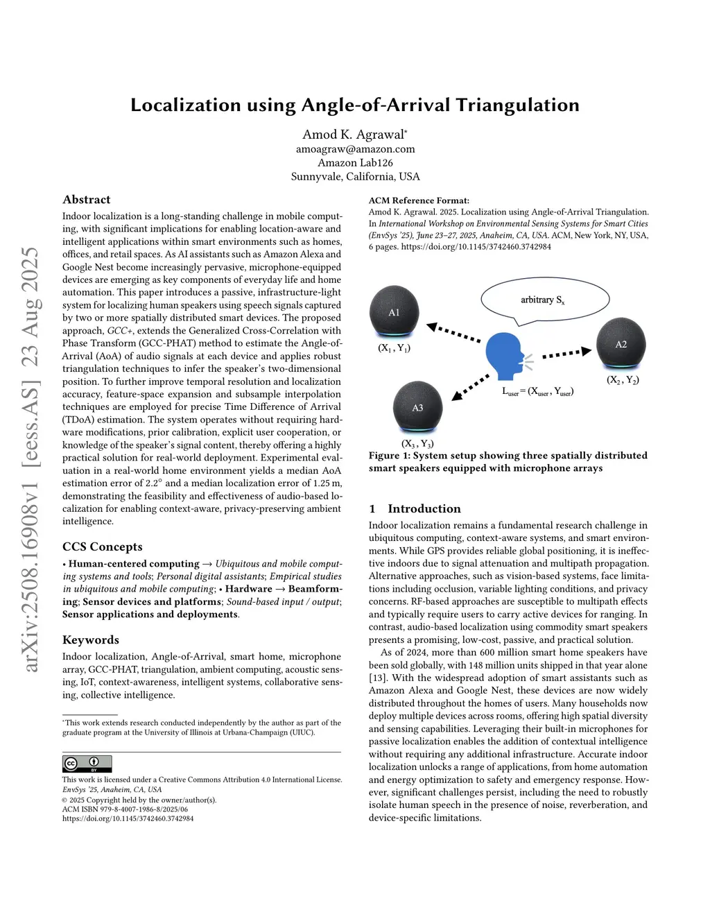 Indoor localization is a long-standing challenge in mobile computing, with significant implications for enabling location-aware and intelligent applications within smart environments such as homes, offices, and retail spaces. As AI assistants such as Amazon Alexa and Google Nest become increasingly pervasive, microphone-equipped devices are emerging as key components of everyday life and home automation. This paper introduces a passive, infrastructure-light system for localizing human speakers using speech signals captured by two or more spatially distributed smart devices. The proposed approach, GCC+, extends the Generalized Cross-Correlation with Phase Transform (GCC-PHAT) method to estimate the Angle-of-Arrival (AoA) of audio signals at each device and applies robust triangulation techniques to infer the speaker's two-dimensional position. To further improve temporal resolution and localization accuracy, feature-space expansion and subsample interpolation techniques are employed for precise Time Difference of Arrival (TDoA) estimation. The system operates without requiring hardware modifications, prior calibration, explicit user cooperation, or knowledge of the speaker's signal content, thereby offering a highly practical solution for real-world deployment. Experimental evaluation in a real-world home environment yields a median AoA estimation error of 2.2 degrees and a median localization error of 1.25 m, demonstrating the feasibility and effectiveness of audio-based localization for enabling context-aware, privacy-preserving ambient intelligence.