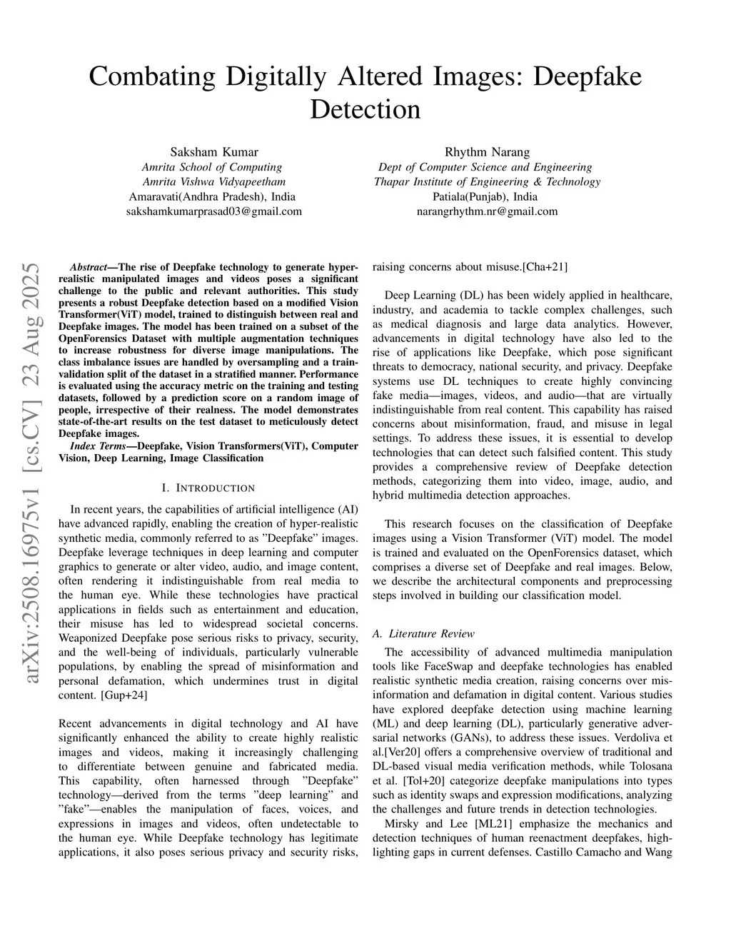 The rise of Deepfake technology to generate hyper-realistic manipulated images and videos poses a significant challenge to the public and relevant authorities. This study presents a robust Deepfake detection based on a modified Vision Transformer(ViT) model, trained to distinguish between real and Deepfake images. The model has been trained on a subset of the OpenForensics Dataset with multiple augmentation techniques to increase robustness for diverse image manipulations. The class imbalance issues are handled by oversampling and a train-validation split of the dataset in a stratified manner. Performance is evaluated using the accuracy metric on the training and testing datasets, followed by a prediction score on a random image of people, irrespective of their realness. The model demonstrates state-of-the-art results on the test dataset to meticulously detect Deepfake images.