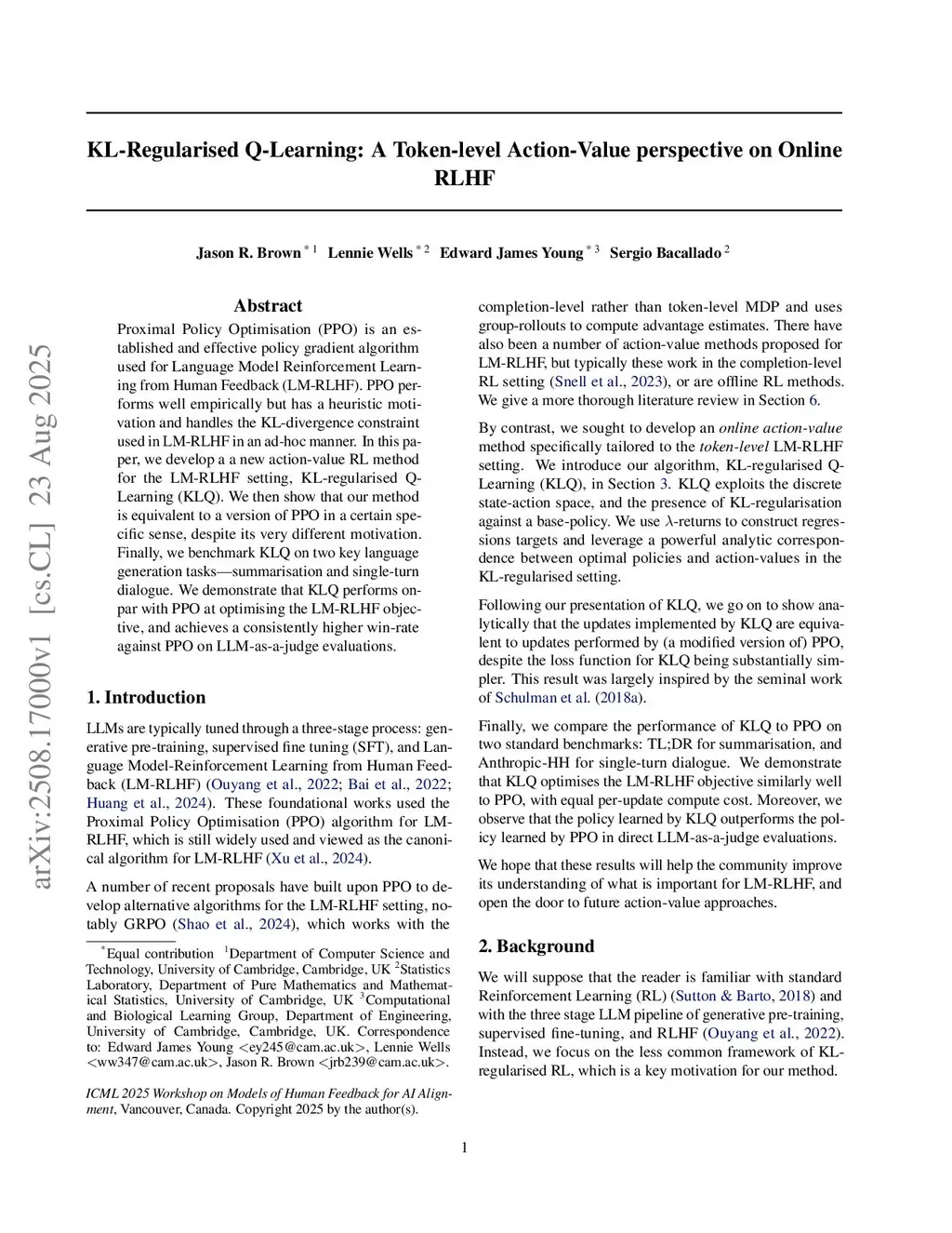 Proximal Policy Optimisation (PPO) is an established and effective policy gradient algorithm used for Language Model Reinforcement Learning from Human Feedback (LM-RLHF). PPO performs well empirically but has a heuristic motivation and handles the KL-divergence constraint used in LM-RLHF in an ad-hoc manner. In this paper, we develop a a new action-value RL method for the LM-RLHF setting, KL-regularised Q-Learning (KLQ). We then show that our method is equivalent to a version of PPO in a certain specific sense, despite its very different motivation. Finally, we benchmark KLQ on two key language generation tasks -- summarisation and single-turn dialogue. We demonstrate that KLQ performs on-par with PPO at optimising the LM-RLHF objective, and achieves a consistently higher win-rate against PPO on LLM-as-a-judge evaluations.