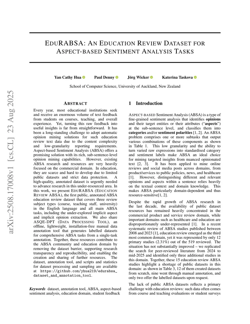 Every year, most educational institutions seek and receive an enormous volume of text feedback from students on courses, teaching, and overall experience. Yet, turning this raw feedback into useful insights is far from straightforward. It has been a long-standing challenge to adopt automatic opinion mining solutions for such education review text data due to the content complexity and low-granularity reporting requirements. Aspect-based Sentiment Analysis (ABSA) offers a promising solution with its rich, sub-sentence-level opinion mining capabilities. However, existing ABSA research and resources are very heavily focused on the commercial domain. In education, they are scarce and hard to develop due to limited public datasets and strict data protection. A high-quality, annotated dataset is urgently needed to advance research in this under-resourced area. In this work, we present EduRABSA (Education Review ABSA), the first public, annotated ABSA education review dataset that covers three review subject types (course, teaching staff, university) in the English language and all main ABSA tasks, including the under-explored implicit aspect and implicit opinion extraction. We also share ASQE-DPT (Data Processing Tool), an offline, lightweight, installation-free manual data annotation tool that generates labelled datasets for comprehensive ABSA tasks from a single-task annotation. Together, these resources contribute to the ABSA community and education domain by removing the dataset barrier, supporting research transparency and reproducibility, and enabling the creation and sharing of further resources. The dataset, annotation tool, and scripts and statistics for dataset processing and sampling are available atthis https URL.