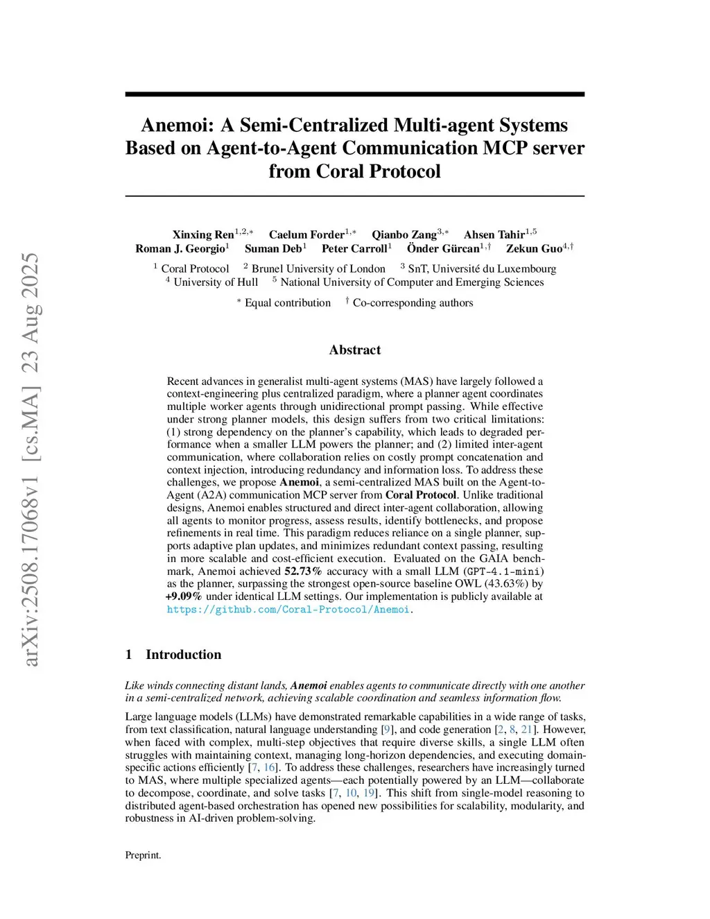Anemoi: A Semi-Centralized Multi-agent System Based on Agent-to-Agent Communication MCP server from Coral Protocol