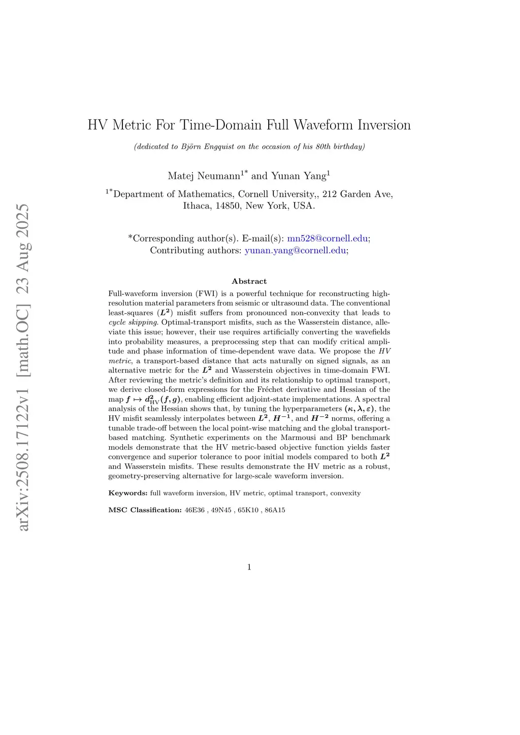 HV Metric For Time-Domain Full Waveform Inversion