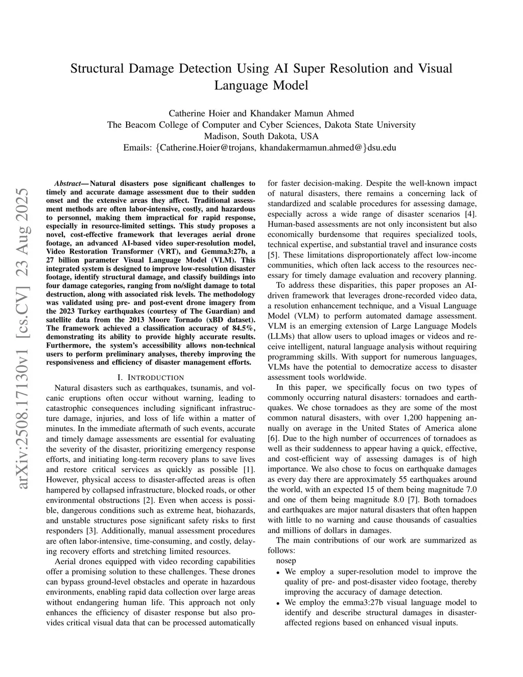 Natural disasters pose significant challenges to timely and accurate damage assessment due to their sudden onset and the extensive areas they affect. Traditional assessment methods are often labor-intensive, costly, and hazardous to personnel, making them impractical for rapid response, especially in resource-limited settings. This study proposes a novel, cost-effective framework that leverages aerial drone footage, an advanced AI-based video super-resolution model, Video Restoration Transformer (VRT), and Gemma3:27b, a 27 billion parameter Visual Language Model (VLM). This integrated system is designed to improve low-resolution disaster footage, identify structural damage, and classify buildings into four damage categories, ranging from no/slight damage to total destruction, along with associated risk levels. The methodology was validated using pre- and post-event drone imagery from the 2023 Turkey earthquakes (courtesy of The Guardian) and satellite data from the 2013 Moore Tornado (xBD dataset). The framework achieved a classification accuracy of 84.5%, demonstrating its ability to provide highly accurate results. Furthermore, the system's accessibility allows non-technical users to perform preliminary analyses, thereby improving the responsiveness and efficiency of disaster management efforts.