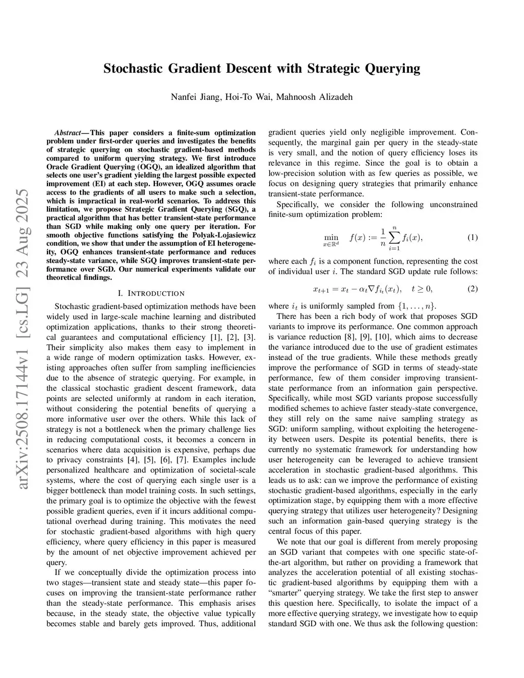 This paper considers a finite-sum optimization problem under first-order queries and investigates the benefits of strategic querying on stochastic gradient-based methods compared to uniform querying strategy. We first introduce Oracle Gradient Querying (OGQ), an idealized algorithm that selects one user's gradient yielding the largest possible expected improvement (EI) at each step. However, OGQ assumes oracle access to the gradients of all users to make such a selection, which is impractical in real-world scenarios. To address this limitation, we propose Strategic Gradient Querying (SGQ), a practical algorithm that has better transient-state performance than SGD while making only one query per iteration. For smooth objective functions satisfying the Polyak-Lojasiewicz condition, we show that under the assumption of EI heterogeneity, OGQ enhances transient-state performance and reduces steady-state variance, while SGQ improves transient-state performance over SGD. Our numerical experiments validate our theoretical findings.