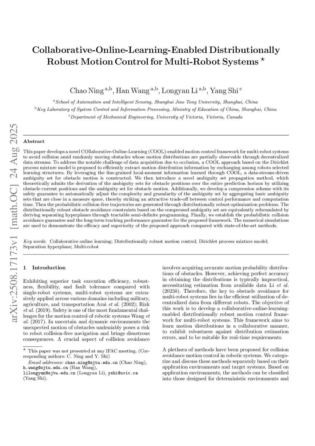 This paper develops a novel COllaborative-Online-Learning (COOL)-enabled motion control framework for multi-robot systems to avoid collision amid randomly moving obstacles whose motion distributions are partially observable through decentralized data streams. To address the notable challenge of data acquisition due to occlusion, a COOL approach based on the Dirichlet process mixture model is proposed to efficiently extract motion distribution information by exchanging among robots selected learning structures. By leveraging the fine-grained local-moment information learned through COOL, a data-stream-driven ambiguity set for obstacle motion is constructed. We then introduce a novel ambiguity set propagation method, which theoretically admits the derivation of the ambiguity sets for obstacle positions over the entire prediction horizon by utilizing obstacle current positions and the ambiguity set for obstacle motion. Additionally, we develop a compression scheme with its safety guarantee to automatically adjust the complexity and granularity of the ambiguity set by aggregating basic ambiguity sets that are close in a measure space, thereby striking an attractive trade-off between control performance and computation time. Then the probabilistic collision-free trajectories are generated through distributionally robust optimization problems. The distributionally robust obstacle avoidance constraints based on the compressed ambiguity set are equivalently reformulated by deriving separating hyperplanes through tractable semi-definite programming. Finally, we establish the probabilistic collision avoidance guarantee and the long-term tracking performance guarantee for the proposed framework. The numerical simulations are used to demonstrate the efficacy and superiority of the proposed approach compared with state-of-the-art methods.