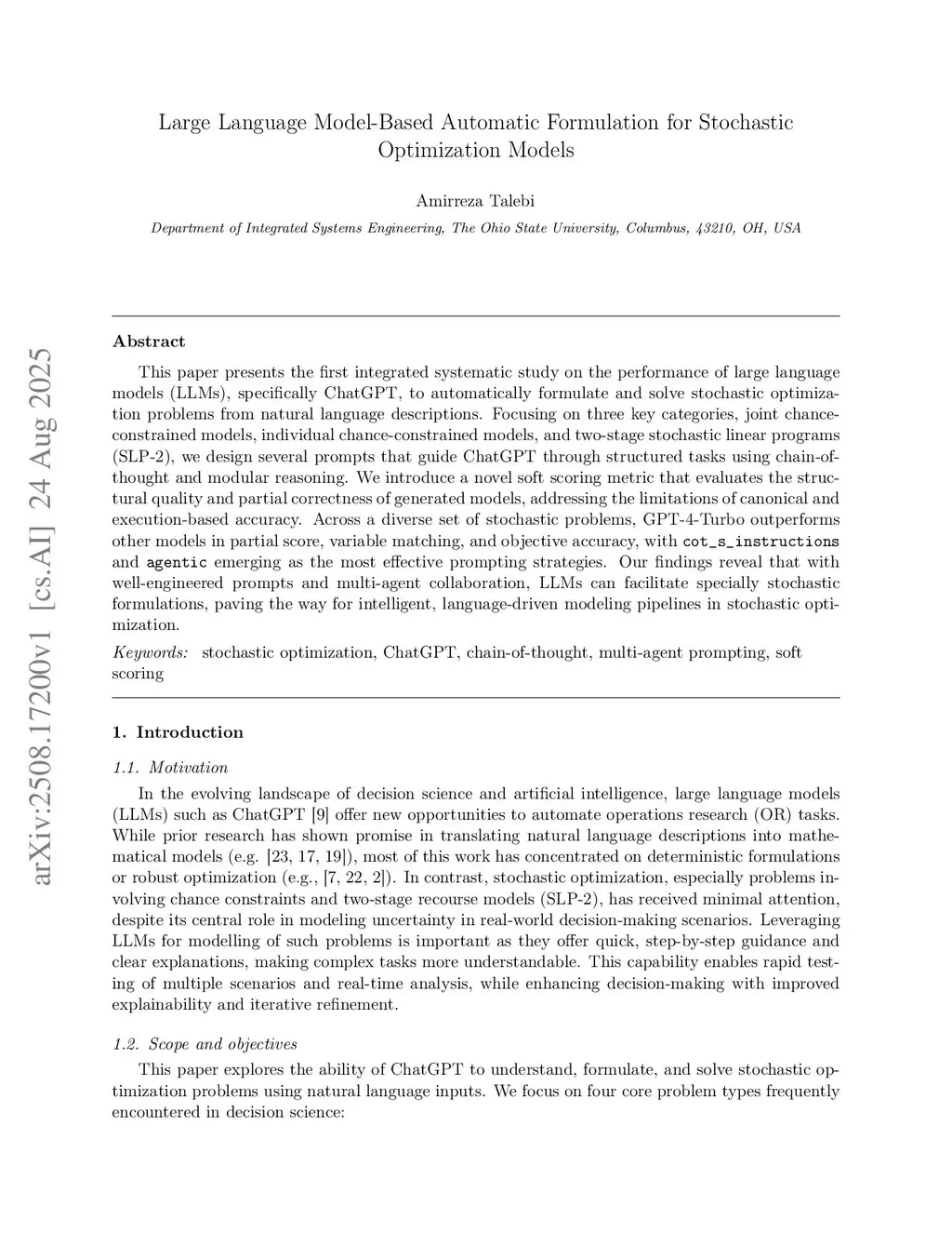 This paper presents an integrated systematic study of the performance of large language models (LLMs), specifically ChatGPT, for automatically formulating and solving Stochastic Optimization (SO) problems from natural language descriptions. Focusing on three key categories, individual chance-constrained models, joint chance-constrained models, and two-stage stochastic mixed-integer linear programming models, we design several prompts that guide ChatGPT through structured tasks using chain-of-thought and agentic reasoning. We introduce a novel soft-scoring metric that evaluates the structural quality and partial correctness of generated models, addressing the limitations of canonical and execution-based accuracy metrics. Across a diverse set of SO problems, GPT-4-Turbo achieves better partial scores than GPT-3.5 variants except for individual chance-constrained problems. Structured prompts significantly outperform simple prompting, reducing extra-element generation and improving objective matching, although extra-element generation remains a nontrivial task. Our findings reveal that with well-engineered prompts and multi-agent collaboration, LLMs can facilitate SO formulations, paving the way for intelligent, language-driven modeling pipelines for SO in practice.
