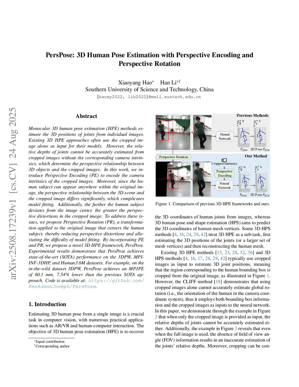 PersPose: 3D Human Pose Estimation with Perspective Encoding and Perspective Rotation