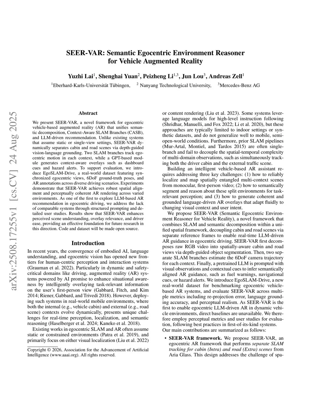 We present SEER-VAR, a novel framework for egocentric vehicle-based augmented reality (AR) that unifies semantic decomposition, Context-Aware SLAM Branches (CASB), and LLM-driven recommendation. Unlike existing systems that assume static or single-view settings, SEER-VAR dynamically separates cabin and road scenes via depth-guided vision-language grounding. Two SLAM branches track egocentric motion in each context, while a GPT-based module generates context-aware overlays such as dashboard cues and hazard alerts. To support evaluation, we introduce EgoSLAM-Drive, a real-world dataset featuring synchronized egocentric views, 6DoF ground-truth poses, and AR annotations across diverse driving scenarios. Experiments demonstrate that SEER-VAR achieves robust spatial alignment and perceptually coherent AR rendering across varied environments. As one of the first to explore LLM-based AR recommendation in egocentric driving, we address the lack of comparable systems through structured prompting and detailed user studies. Results show that SEER-VAR enhances perceived scene understanding, overlay relevance, and driver ease, providing an effective foundation for future research in this direction. Code and dataset will be made open source.
