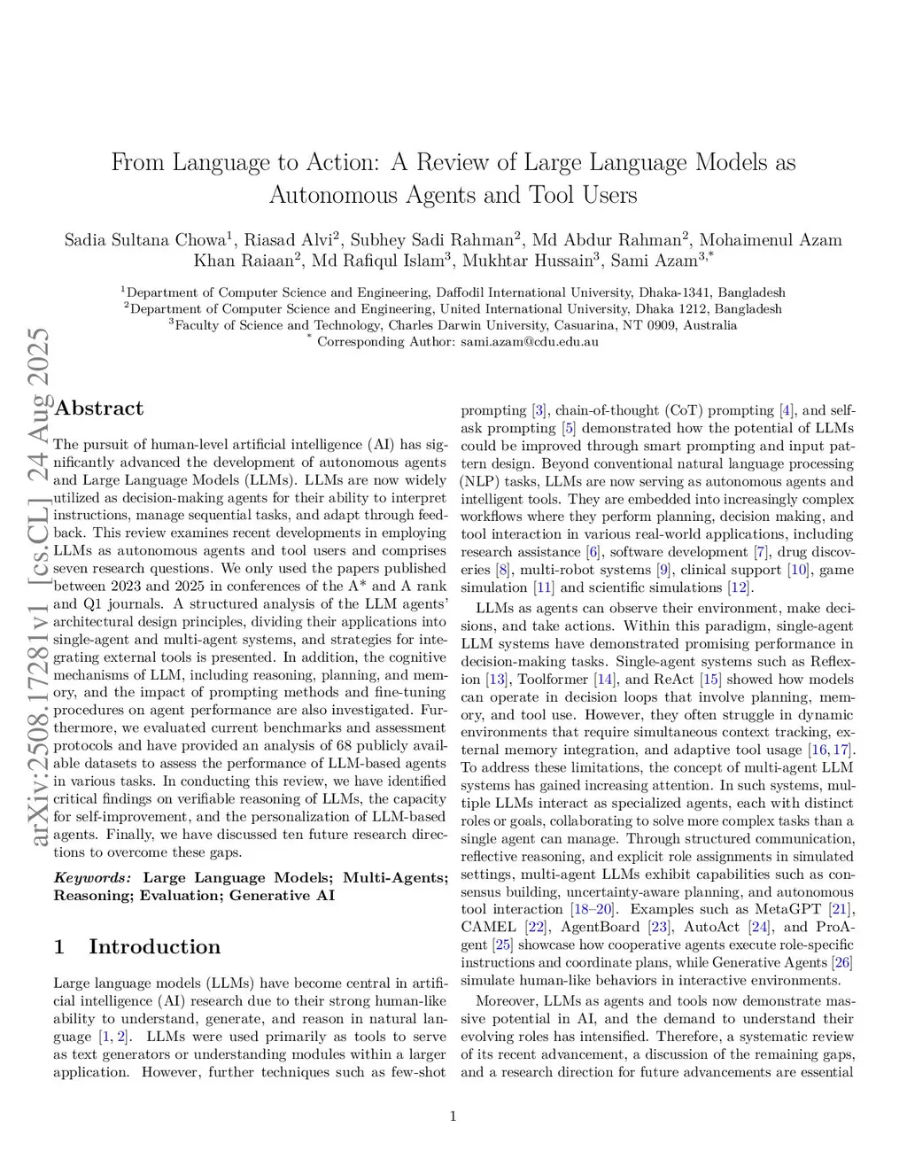 The pursuit of human-level artificial intelligence (AI) has significantly advanced the development of autonomous agents and Large Language Models (LLMs). LLMs are now widely utilized as decision-making agents for their ability to interpret instructions, manage sequential tasks, and adapt through feedback. This review examines recent developments in employing LLMs as autonomous agents and tool users and comprises seven research questions. We only used the papers published between 2023 and 2025 in conferences of the A* and A rank and Q1 journals. A structured analysis of the LLM agents' architectural design principles, dividing their applications into single-agent and multi-agent systems, and strategies for integrating external tools is presented. In addition, the cognitive mechanisms of LLM, including reasoning, planning, and memory, and the impact of prompting methods and fine-tuning procedures on agent performance are also investigated. Furthermore, we evaluated current benchmarks and assessment protocols and have provided an analysis of 68 publicly available datasets to assess the performance of LLM-based agents in various tasks. In conducting this review, we have identified critical findings on verifiable reasoning of LLMs, the capacity for self-improvement, and the personalization of LLM-based agents. Finally, we have discussed ten future research directions to overcome these gaps.