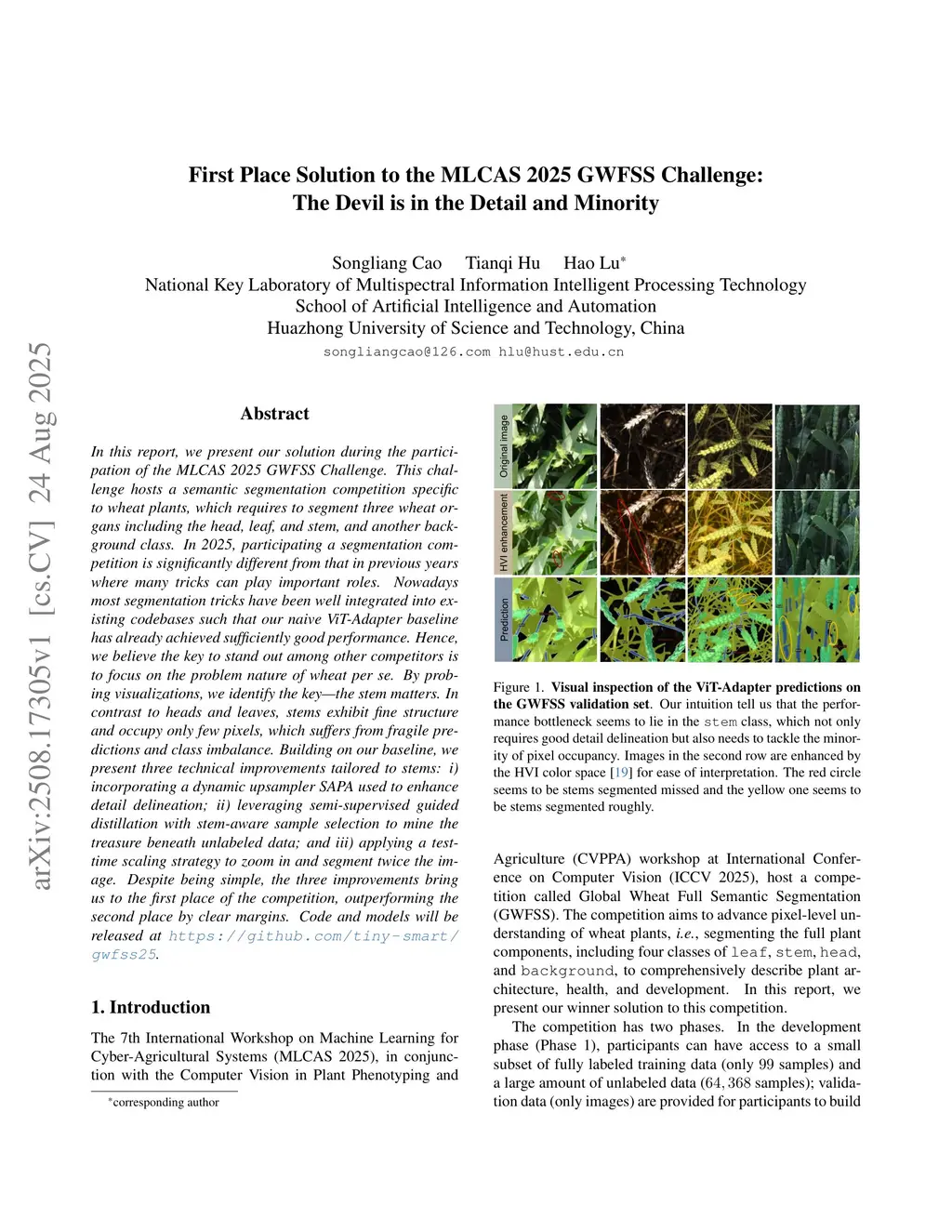 In this report, we present our solution during the participation of the MLCAS 2025 GWFSS Challenge. This challenge hosts a semantic segmentation competition specific to wheat plants, which requires to segment three wheat organs including the head, leaf, and stem, and another background class. In 2025, participating a segmentation competition is significantly different from that in previous years where many tricks can play important roles. Nowadays most segmentation tricks have been well integrated into existing codebases such that our naive ViT-Adapter baseline has already achieved sufficiently good performance. Hence, we believe the key to stand out among other competitors is to focus on the problem nature of wheat per se. By probing visualizations, we identify the key -- the stem matters. In contrast to heads and leaves, stems exhibit fine structure and occupy only few pixels, which suffers from fragile predictions and class imbalance. Building on our baseline, we present three technical improvements tailored to stems: i) incorporating a dynamic upsampler SAPA used to enhance detail delineation; ii) leveraging semi-supervised guided distillation with stem-aware sample selection to mine the treasure beneath unlabeled data; and iii) applying a test-time scaling strategy to zoom in and segment twice the image. Despite being simple, the three improvements bring us to the first place of the competition, outperforming the second place by clear margins. Code and models will be released atthis https URL.