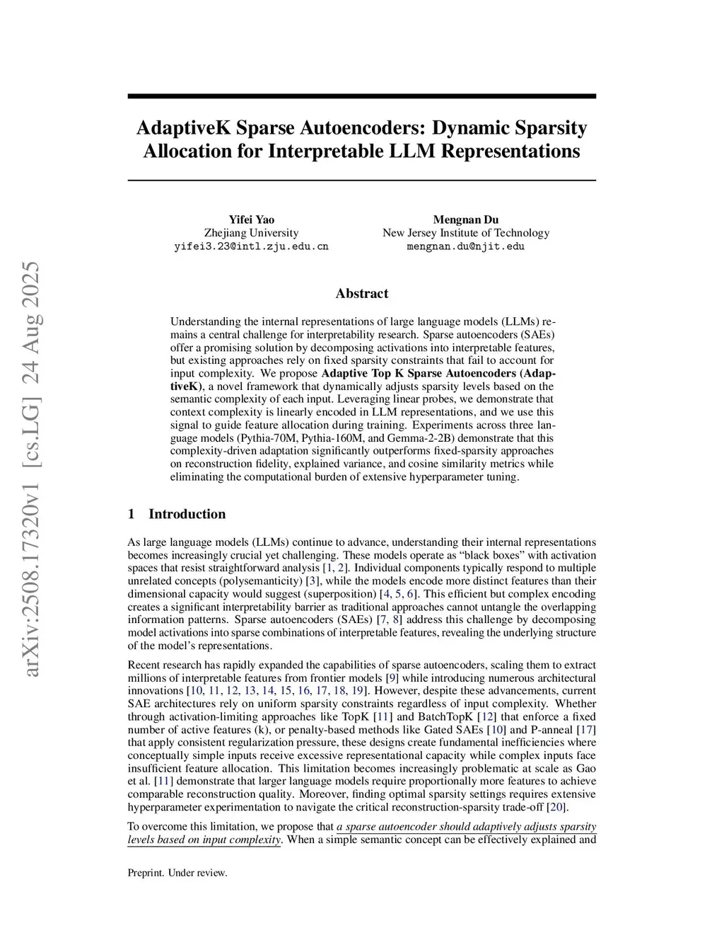 Understanding the internal representations of large language models (LLMs) remains a central challenge for interpretability research. Sparse autoencoders (SAEs) offer a promising solution by decomposing activations into interpretable features, but existing approaches rely on fixed sparsity constraints that fail to account for input complexity. We propose AdaptiveK SAE (Adaptive Top K Sparse Autoencoders), a novel framework that dynamically adjusts sparsity levels based on the semantic complexity of each input. Leveraging linear probes, we demonstrate that context complexity is linearly encoded in LLM representations, and we use this signal to guide feature allocation during training. Experiments across ten language models (from 70M to 14B parameters) demonstrate that this complexity-driven adaptation significantly outperforms fixed-sparsity approaches on reconstruction fidelity, explained variance, cosine similarity and interpretability metrics while eliminating the computational burden of extensive hyperparameter tuning.