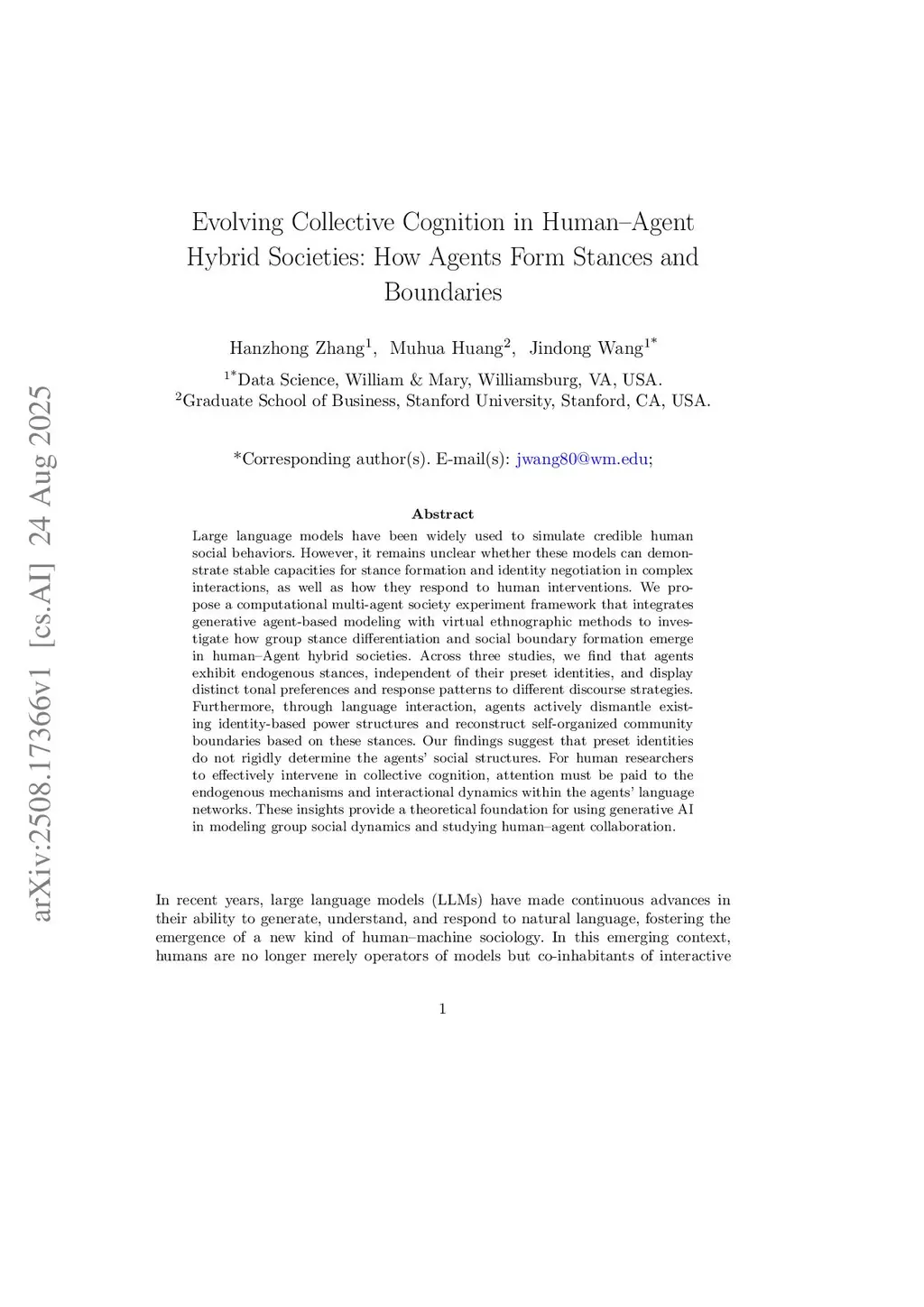 Large language models have been widely used to simulate credible human social behaviors. However, it remains unclear whether these models can demonstrate stable capacities for stance formation and identity negotiation in complex interactions, as well as how they respond to human interventions. We propose a computational multi-agent society experiment framework that integrates generative agent-based modeling with virtual ethnographic methods to investigate how group stance differentiation and social boundary formation emerge in human-agent hybrid societies. Across three studies, we find that agents exhibit endogenous stances, independent of their preset identities, and display distinct tonal preferences and response patterns to different discourse strategies. Furthermore, through language interaction, agents actively dismantle existing identity-based power structures and reconstruct self-organized community boundaries based on these stances. Our findings suggest that preset identities do not rigidly determine the agents' social structures. For human researchers to effectively intervene in collective cognition, attention must be paid to the endogenous mechanisms and interactional dynamics within the agents' language networks. These insights provide a theoretical foundation for using generative AI in modeling group social dynamics and studying human-agent collaboration.