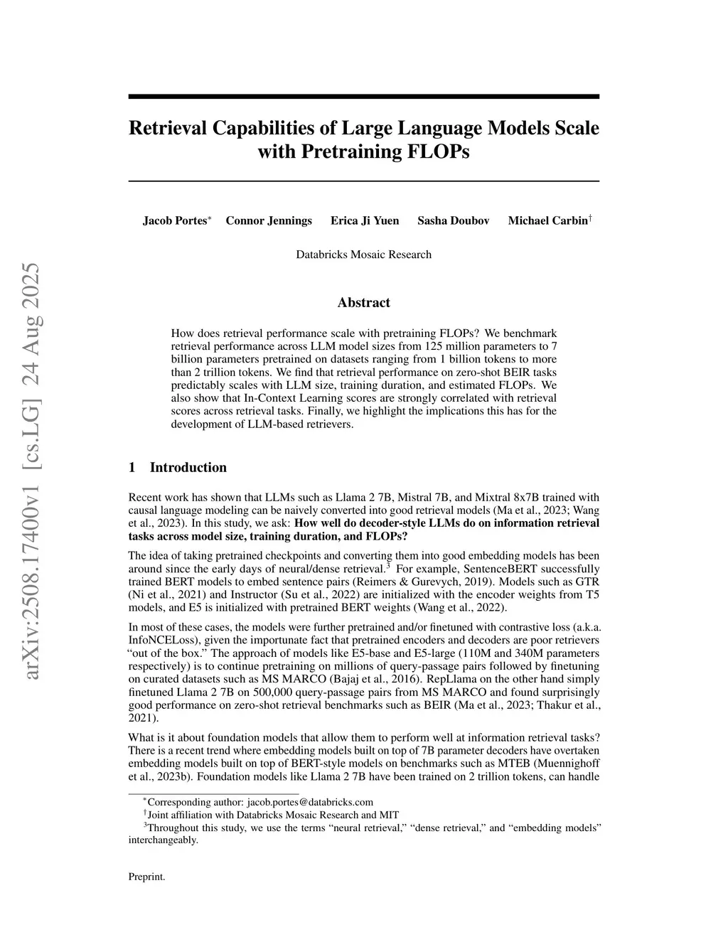 How does retrieval performance scale with pretraining FLOPs? We benchmark retrieval performance across LLM model sizes from 125 million parameters to 7 billion parameters pretrained on datasets ranging from 1 billion tokens to more than 2 trillion tokens. We find that retrieval performance on zero-shot BEIR tasks predictably scales with LLM size, training duration, and estimated FLOPs. We also show that In-Context Learning scores are strongly correlated with retrieval scores across retrieval tasks. Finally, we highlight the implications this has for the development of LLM-based retrievers.
