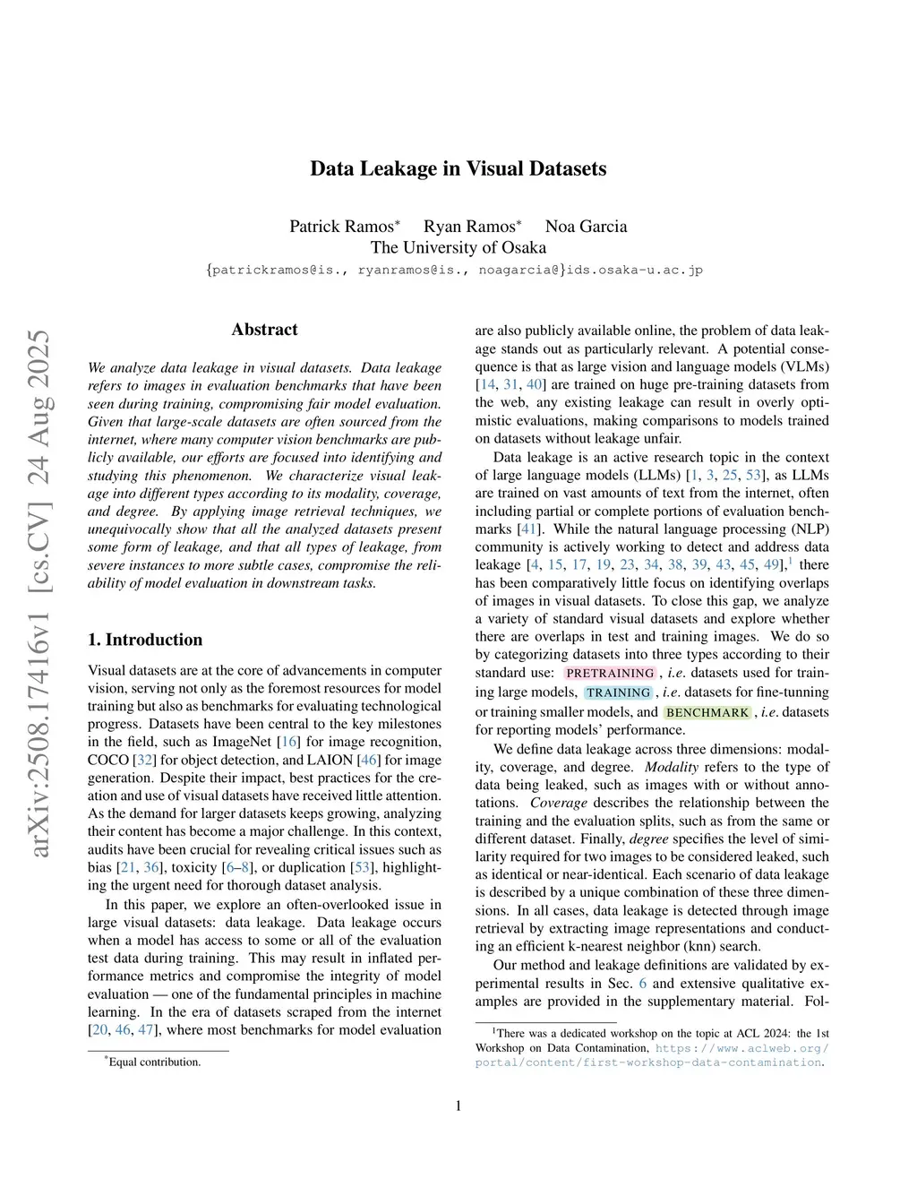 We analyze data leakage in visual datasets. Data leakage refers to images in evaluation benchmarks that have been seen during training, compromising fair model evaluation. Given that large-scale datasets are often sourced from the internet, where many computer vision benchmarks are publicly available, our efforts are focused into identifying and studying this phenomenon. We characterize visual leakage into different types according to its modality, coverage, and degree. By applying image retrieval techniques, we unequivocally show that all the analyzed datasets present some form of leakage, and that all types of leakage, from severe instances to more subtle cases, compromise the reliability of model evaluation in downstream tasks.