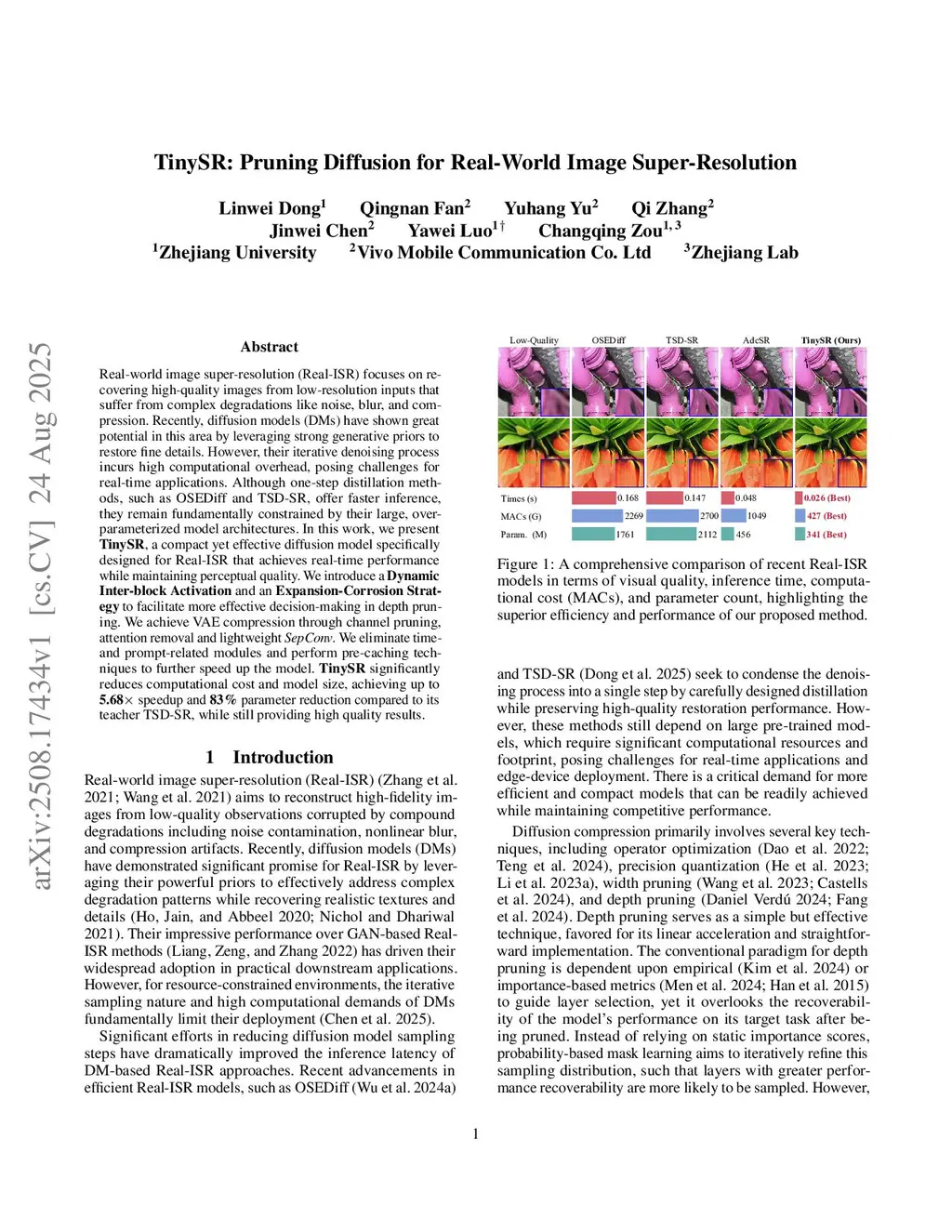Real-world image super-resolution (Real-ISR) focuses on recovering high-quality images from low-resolution inputs that suffer from complex degradations like noise, blur, and compression. Recently, diffusion models (DMs) have shown great potential in this area by leveraging strong generative priors to restore fine details. However, their iterative denoising process incurs high computational overhead, posing challenges for real-time applications. Although one-step distillation methods, such as OSEDiff and TSD-SR, offer faster inference, they remain fundamentally constrained by their large, over-parameterized model architectures. In this work, we present TinySR, a compact yet effective diffusion model specifically designed for Real-ISR that achieves real-time performance while maintaining perceptual quality. We introduce a Dynamic Inter-block Activation and an Expansion-Corrosion Strategy to facilitate more effective decision-making in depth pruning. We achieve VAE compression through channel pruning, attention removal and lightweight SepConv. We eliminate time- and prompt-related modules and perform pre-caching techniques to further speed up the model. TinySR significantly reduces computational cost and model size, achieving up to 5.68x speedup and 83% parameter reduction compared to its teacher TSD-SR, while still providing high quality results.