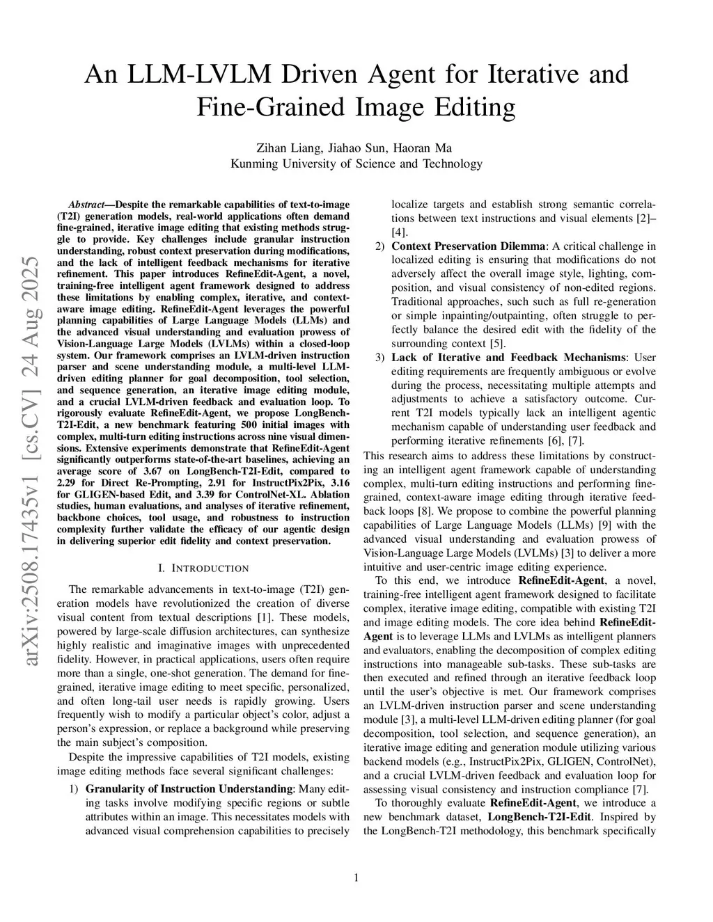 Despite the remarkable capabilities of text-to-image (T2I) generation models, real-world applications often demand fine-grained, iterative image editing that existing methods struggle to provide. Key challenges include granular instruction understanding, robust context preservation during modifications, and the lack of intelligent feedback mechanisms for iterative refinement. This paper introduces RefineEdit-Agent, a novel, training-free intelligent agent framework designed to address these limitations by enabling complex, iterative, and context-aware image editing. RefineEdit-Agent leverages the powerful planning capabilities of Large Language Models (LLMs) and the advanced visual understanding and evaluation prowess of Vision-Language Large Models (LVLMs) within a closed-loop system. Our framework comprises an LVLM-driven instruction parser and scene understanding module, a multi-level LLM-driven editing planner for goal decomposition, tool selection, and sequence generation, an iterative image editing module, and a crucial LVLM-driven feedback and evaluation loop. To rigorously evaluate RefineEdit-Agent, we propose LongBench-T2I-Edit, a new benchmark featuring 500 initial images with complex, multi-turn editing instructions across nine visual dimensions. Extensive experiments demonstrate that RefineEdit-Agent significantly outperforms state-of-the-art baselines, achieving an average score of 3.67 on LongBench-T2I-Edit, compared to 2.29 for Direct Re-Prompting, 2.91 for InstructPix2Pix, 3.16 for GLIGEN-based Edit, and 3.39 for ControlNet-XL. Ablation studies, human evaluations, and analyses of iterative refinement, backbone choices, tool usage, and robustness to instruction complexity further validate the efficacy of our agentic design in delivering superior edit fidelity and context preservation.