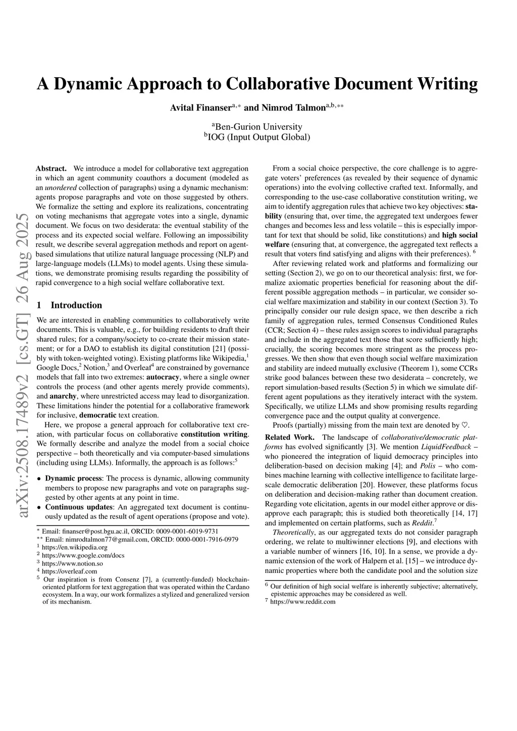 We introduce a model for collaborative text aggregation in which an agent community coauthors a document, modeled as an unordered collection of paragraphs, using a dynamic mechanism: agents propose paragraphs and vote on those suggested by others. We formalize the setting and explore its realizations, concentrating on voting mechanisms that aggregate votes into a single, dynamic document. We focus on two desiderata: the eventual stability of the process and its expected social welfare. Following an impossibility result, we describe several aggregation methods and report on agent-based simulations that utilize natural language processing (NLP) and large-language models (LLMs) to model agents and their contexts. Using these simulations, we demonstrate promising results regarding the possibility of rapid convergence to a high social welfare collaborative text.