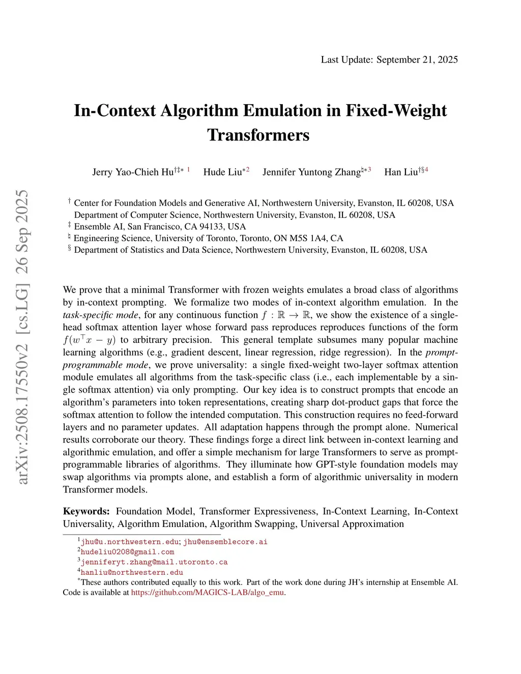 We prove that a minimal Transformer with frozen weights emulates a broad class of algorithms by in-context prompting. We formalize two modes of in-context algorithm emulation. In the task-specific mode, for any continuous function , we show the existence of a single-head softmax attention layer whose forward pass reproduces functions of the form to arbitrary precision. This general template subsumes many popular machine learning algorithms (e.g., gradient descent, linear regression, ridge regression). In the prompt-programmable mode, we prove universality: a single fixed-weight two-layer softmax attention module emulates all algorithms from the task-specific class (i.e., each implementable by a single softmax attention) via only prompting. Our key idea is to construct prompts that encode an algorithm's parameters into token representations, creating sharp dot-product gaps that force the softmax attention to follow the intended computation. This construction requires no feed-forward layers and no parameter updates. All adaptation happens through the prompt alone. Numerical results corroborate our theory. These findings forge a direct link between in-context learning and algorithmic emulation, and offer a simple mechanism for large Transformers to serve as prompt-programmable libraries of algorithms. They illuminate how GPT-style foundation models may swap algorithms via prompts alone, and establish a form of algorithmic universality in modern Transformer models.