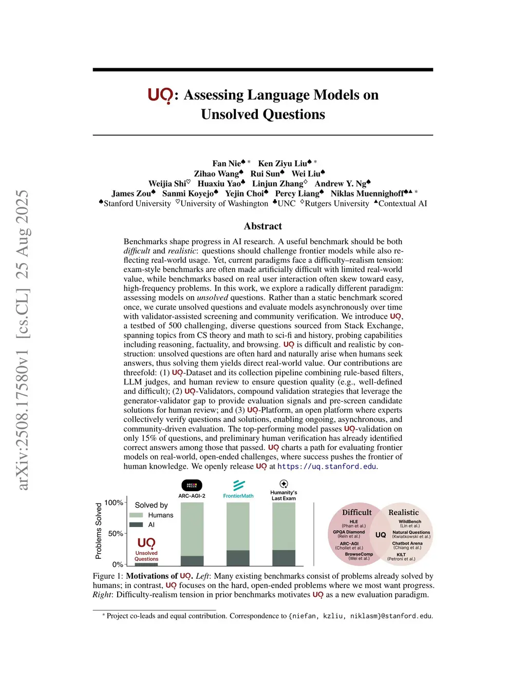 Benchmarks shape progress in AI research. A useful benchmark should be both difficult and realistic: questions should challenge frontier models while also reflecting real-world usage. Yet, current paradigms face a difficulty-realism tension: exam-style benchmarks are often made artificially difficult with limited real-world value, while benchmarks based on real user interaction often skew toward easy, high-frequency problems. In this work, we explore a radically different paradigm: assessing models on unsolved questions. Rather than a static benchmark scored once, we curate unsolved questions and evaluate models asynchronously over time with validator-assisted screening and community verification. We introduce UQ, a testbed of 500 challenging, diverse questions sourced from Stack Exchange, spanning topics from CS theory and math to sci-fi and history, probing capabilities including reasoning, factuality, and browsing. UQ is difficult and realistic by construction: unsolved questions are often hard and naturally arise when humans seek answers, thus solving them yields direct real-world value. Our contributions are threefold: (1) UQ-Dataset and its collection pipeline combining rule-based filters, LLM judges, and human review to ensure question quality (e.g., well-defined and difficult); (2) UQ-Validators, compound validation strategies that leverage the generator-validator gap to provide evaluation signals and pre-screen candidate solutions for human review; and (3) UQ-Platform, an open platform where experts collectively verify questions and solutions. The top model passes UQ-validation on only 15% of questions, and preliminary human verification has already identified correct answers among those that passed. UQ charts a path for evaluating frontier models on real-world, open-ended challenges, where success pushes the frontier of human knowledge. We release UQ atthis https URL.