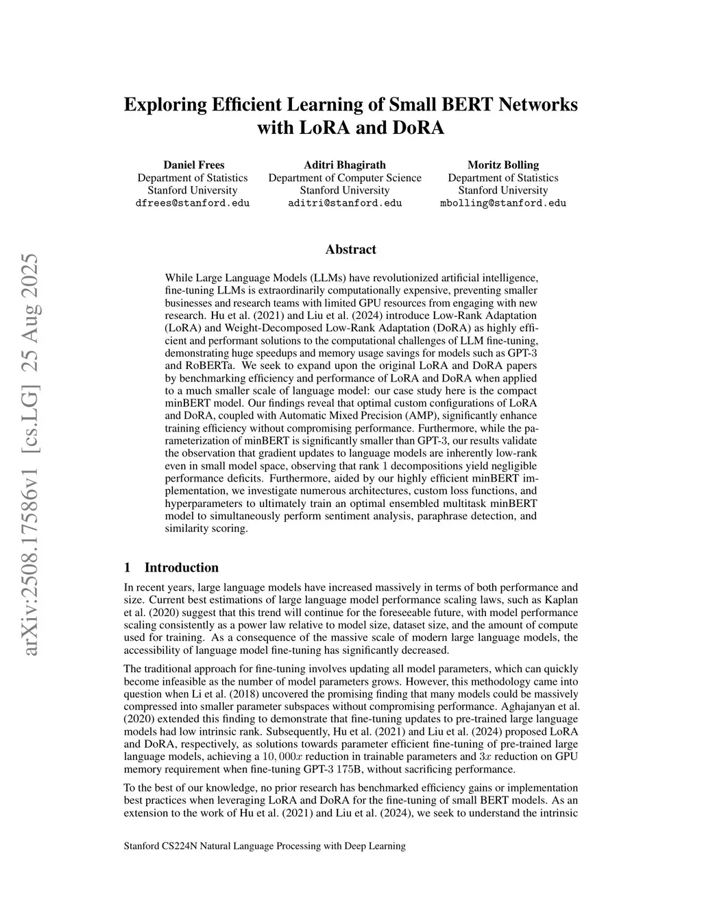 While Large Language Models (LLMs) have revolutionized artificial intelligence, fine-tuning LLMs is extraordinarily computationally expensive, preventing smaller businesses and research teams with limited GPU resources from engaging with new research. Hu et al and Liu et al introduce Low-Rank Adaptation (LoRA) and Weight-Decomposed Low-Rank Adaptation (DoRA) as highly efficient and performant solutions to the computational challenges of LLM fine-tuning, demonstrating huge speedups and memory usage savings for models such as GPT-3 and RoBERTa. We seek to expand upon the original LoRA and DoRA papers by benchmarking efficiency and performance of LoRA and DoRA when applied to a much smaller scale of language model: our case study here is the compact minBERT model. Our findings reveal that optimal custom configurations of LoRA and DoRA, coupled with Automatic Mixed Precision (AMP), significantly enhance training efficiency without compromising performance. Furthermore, while the parameterization of minBERT is significantly smaller than GPT-3, our results validate the observation that gradient updates to language models are inherently low-rank even in small model space, observing that rank 1 decompositions yield negligible performance deficits. Furthermore, aided by our highly efficient minBERT implementation, we investigate numerous architectures, custom loss functions, and hyperparameters to ultimately train an optimal ensembled multitask minBERT model to simultaneously perform sentiment analysis, paraphrase detection, and similarity scoring.