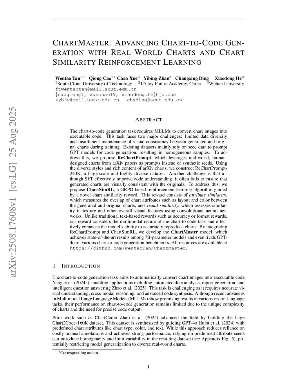 The chart-to-code generation task requires MLLMs to convert chart images into executable code. This task faces two main challenges: limited data diversity and the difficulty of maintaining visual consistency between generated charts and the original ones. Existing datasets mainly rely on synthetic seed data to prompt GPT models for code generation, resulting in homogeneous samples that limit model generalization to real-world chart styles. To address this, we propose ReChartPrompt, leveraging real-world, human-designed charts extracted from arXiv papers as prompts. By harnessing the rich content and diverse visual styles of arXiv charts, we construct ReChartPrompt-240K, a large-scale and highly diverse dataset that better reflects realistic chart variations. For the second challenge, although SFT improves code understanding by optimizing next-token prediction, it does not provide direct supervision on visual features. As a result, it often fails to guarantee that the generated charts visually match the original ones. To address this, we propose ChartSimRL, a GRPO-based reinforcement learning algorithm guided by a novel chart similarity reward. This reward consists of two components: attribute similarity, which measures the overlap of chart attributes like layout and color between the generated and original charts, and visual similarity, which evaluates overall visual features, including texture, using convolutional neural networks. Unlike traditional text-based rewards, our reward accounts for the multimodal nature of the chart-to-code generation task, significantly enhancing the model's ability to accurately reproduce charts. Integrating ReChartPrompt and ChartSimRL, we develop the ChartMaster model, achieving SOTA results among 7B-parameter models and rivaling GPT-4o on various chart-to-code benchmarks. All resources are available atthis https URL.