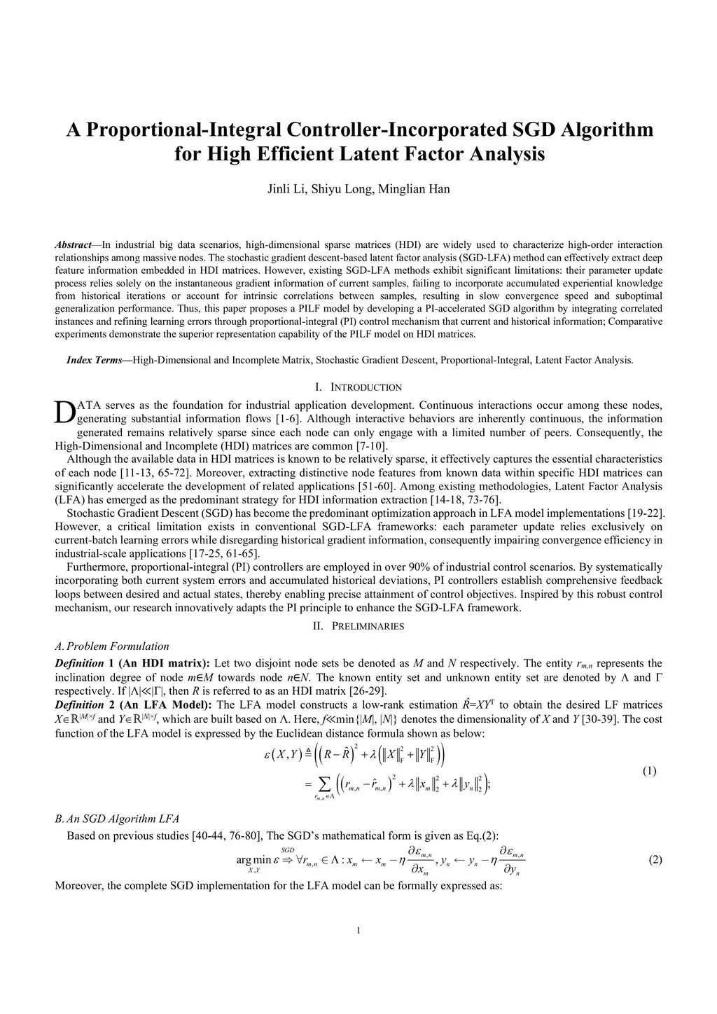 In industrial big data scenarios, high-dimensional sparse matrices (HDI) are widely used to characterize high-order interaction relationships among massive nodes. The stochastic gradient descent-based latent factor analysis (SGD-LFA) method can effectively extract deep feature information embedded in HDI matrices. However, existing SGD-LFA methods exhibit significant limitations: their parameter update process relies solely on the instantaneous gradient information of current samples, failing to incorporate accumulated experiential knowledge from historical iterations or account for intrinsic correlations between samples, resulting in slow convergence speed and suboptimal generalization performance. Thus, this paper proposes a PILF model by developing a PI-accelerated SGD algorithm by integrating correlated instances and refining learning errors through proportional-integral (PI) control mechanism that current and historical information; Comparative experiments demonstrate the superior representation capability of the PILF model on HDI matrices